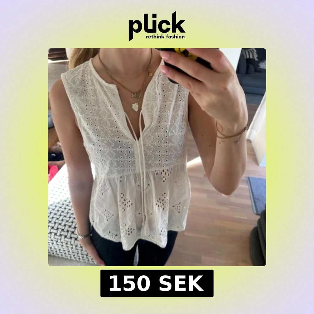 Säljer en söt vit ärmlös blus med broderade blommönster och spetsdetaljer. Blusen har v-ringning med knyt framtill och en luftig, lätt utsvängd passform.