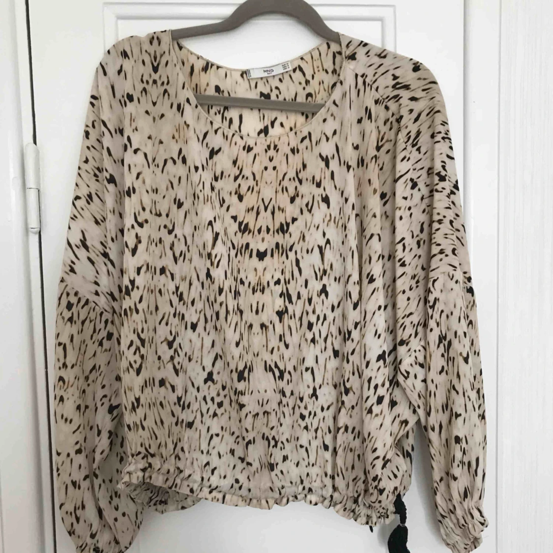 Fin blus i ett snyggt mönster med beiga toner. Finns en dragsko så man kan dra åt den längst ned. Jättefint till sommaren!