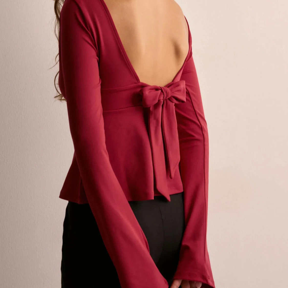 Helt ny!! Snygg röd topp med djup v-ringning och långa ärmar. Toppen har en elegant öppen rygg med en stor rosett som detalj. Perfekt för en stilfull look.