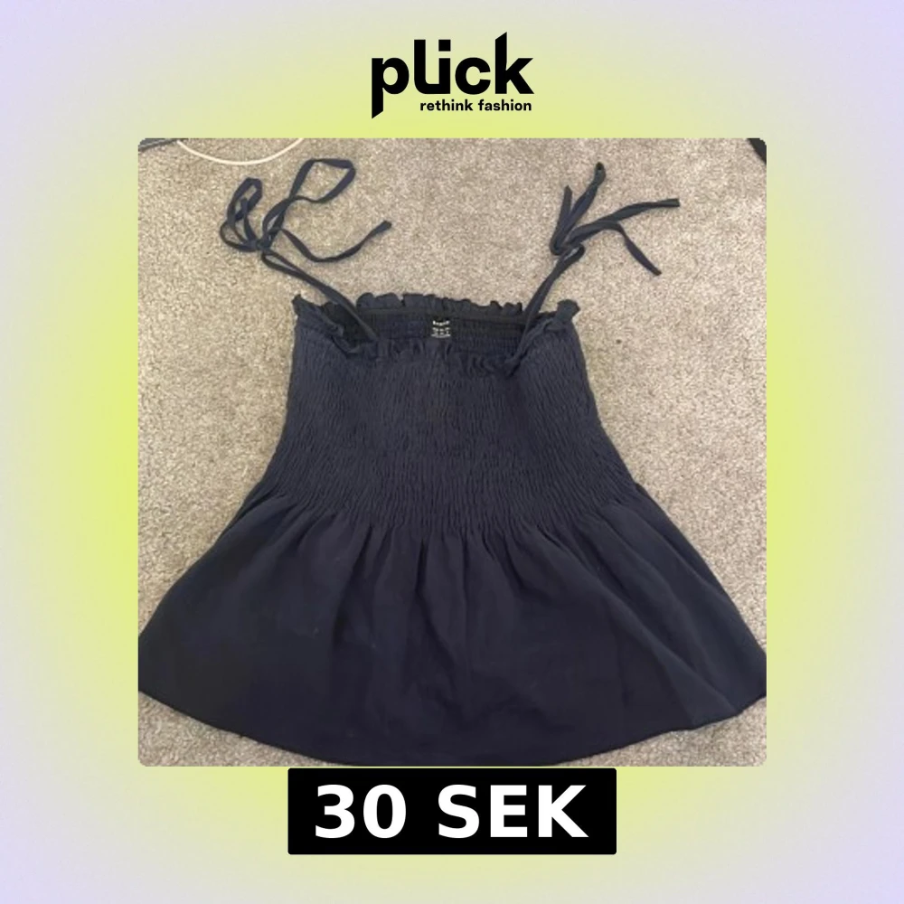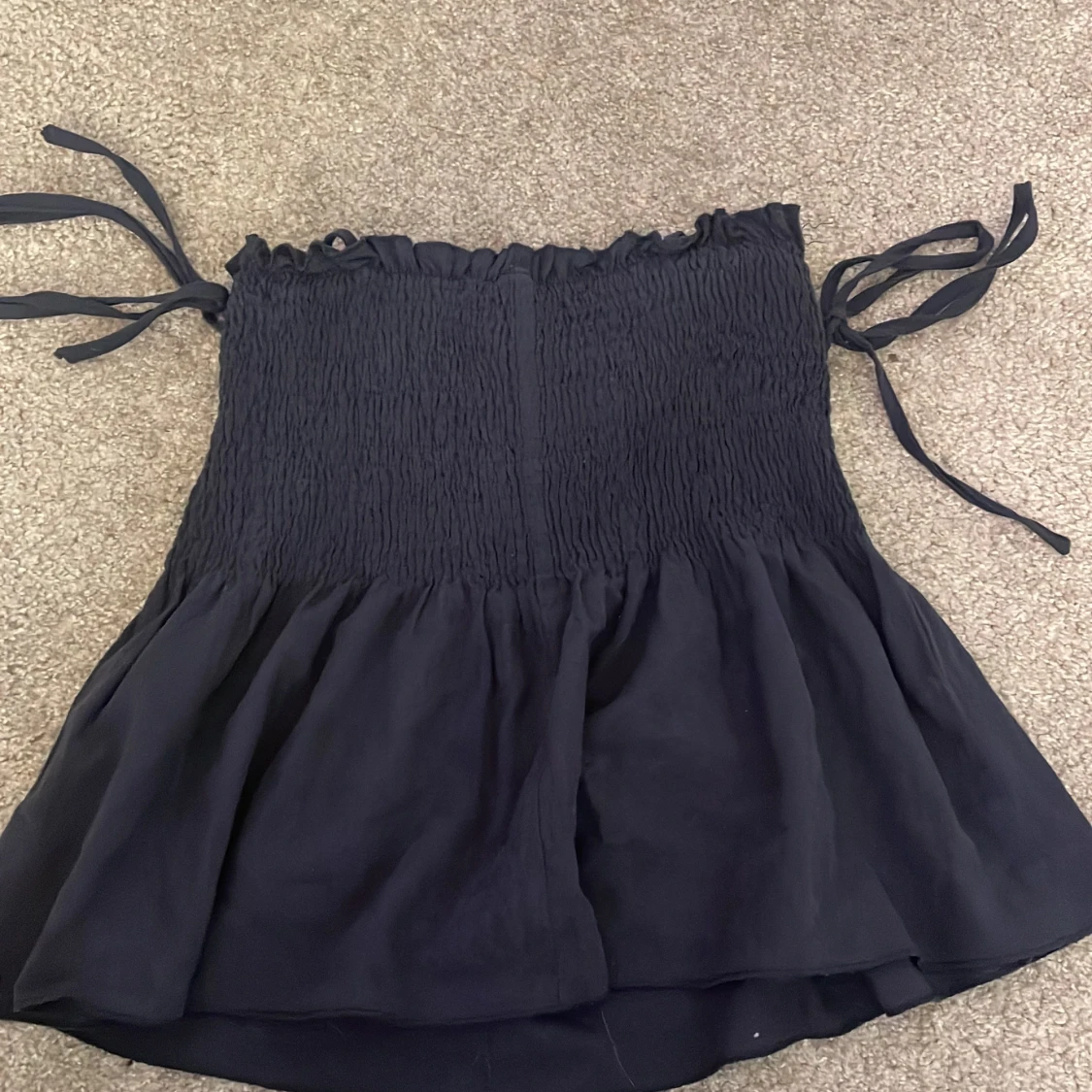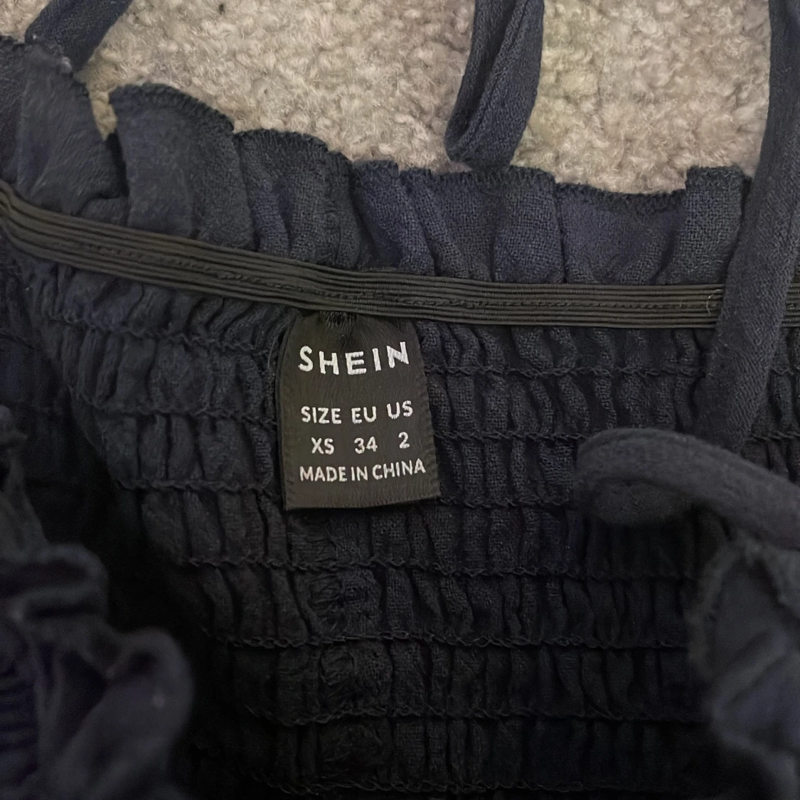 Säljer en marinblå axelbandslös topp från Shein med knytband vid axlarna. Toppen har en smockad överdel och en lätt utsvängd nederdel