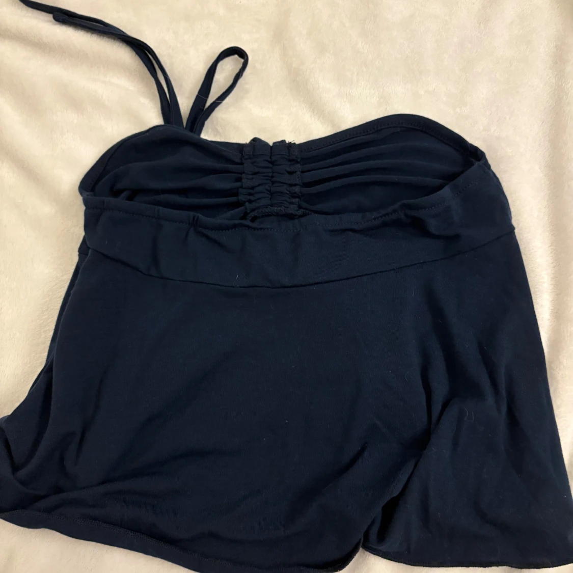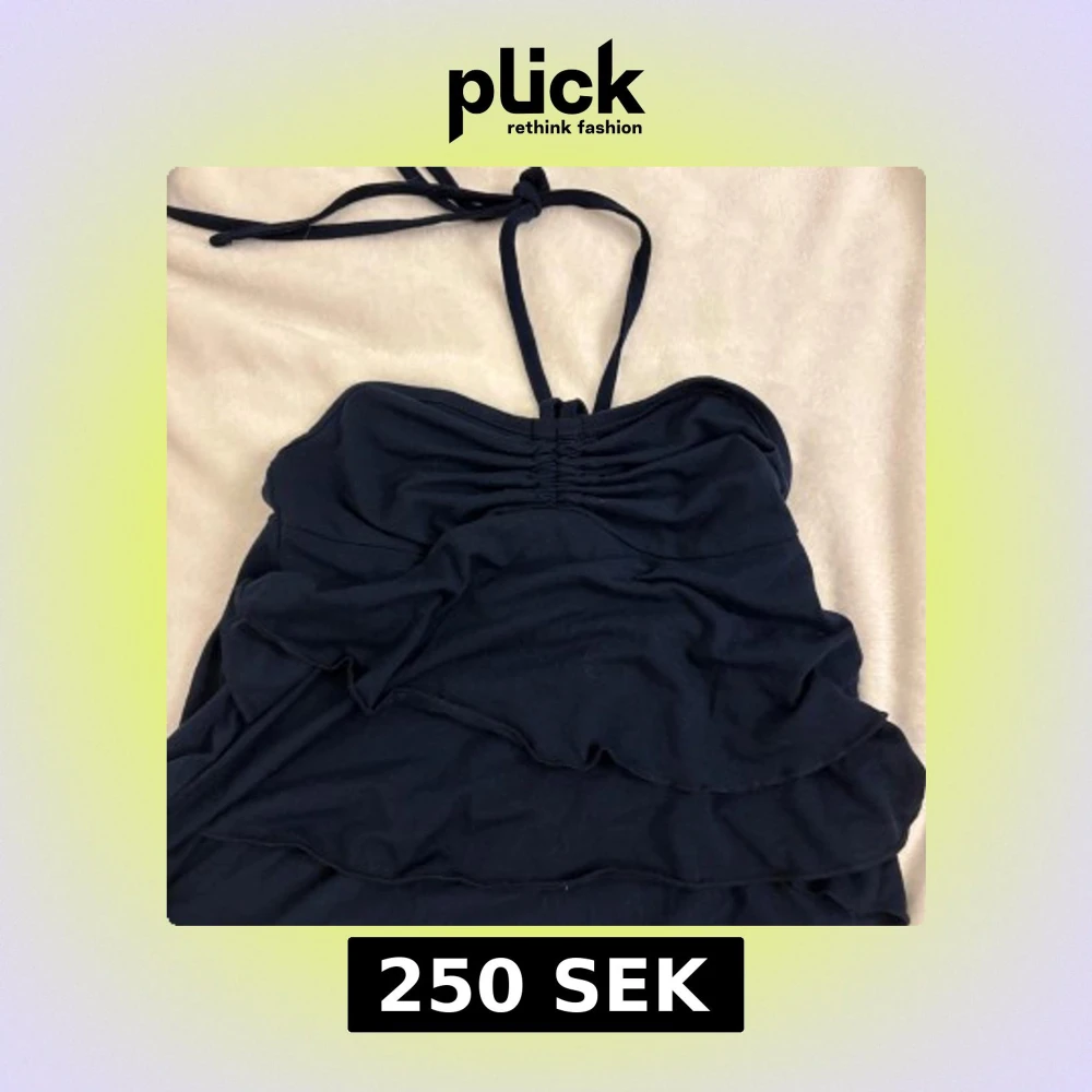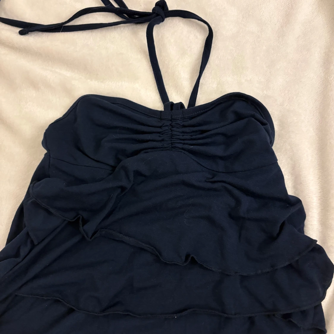 Marinblå halterneck topp som knyts i nacken och har volanger. Hör av er vid funderingar eller om ni vill ha bilder med hur plagget sitter på mig. Titta gärna in mina andra plagg!