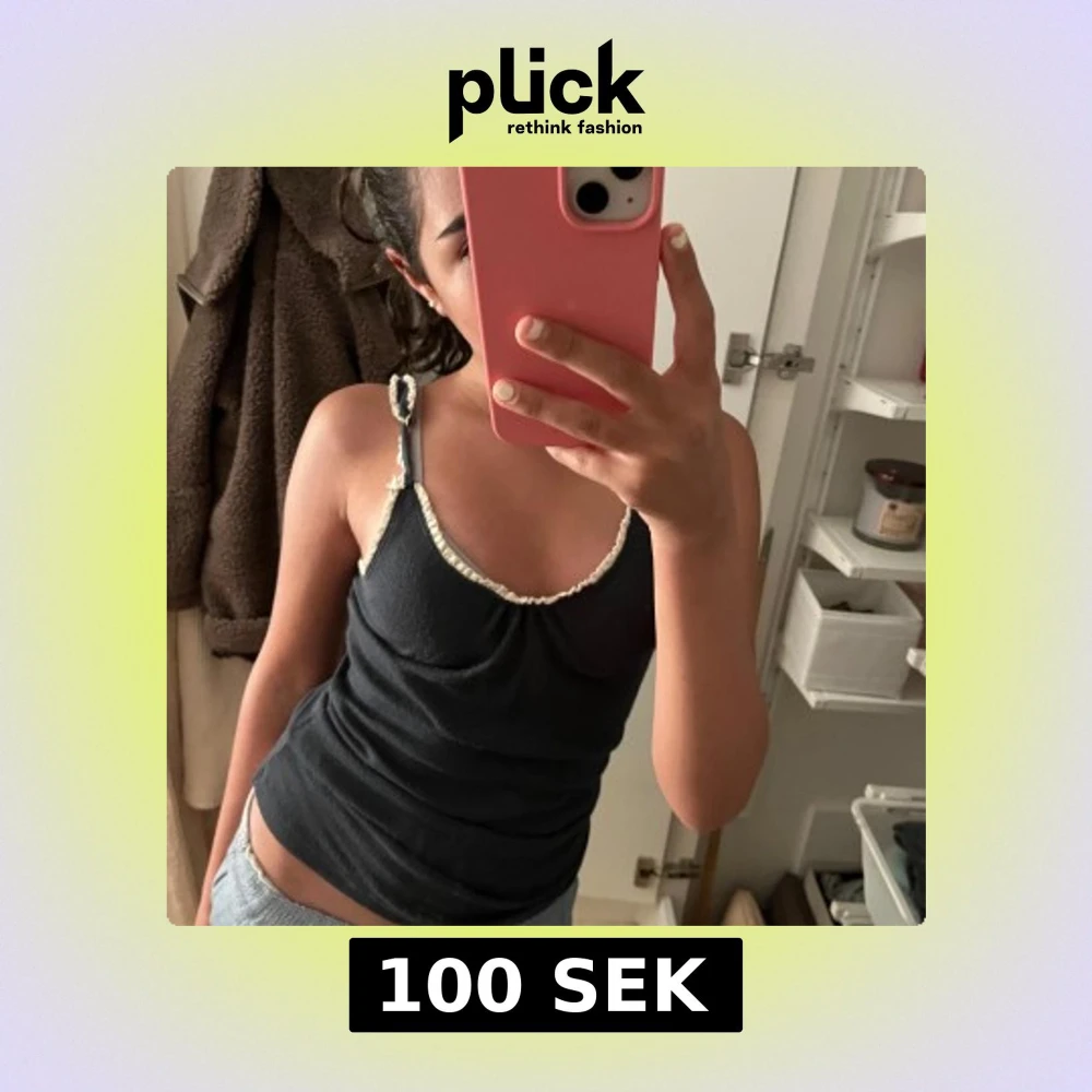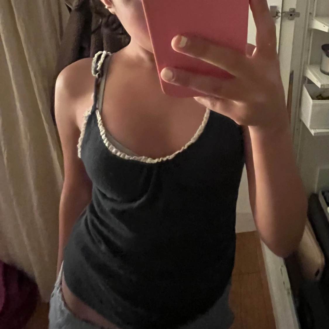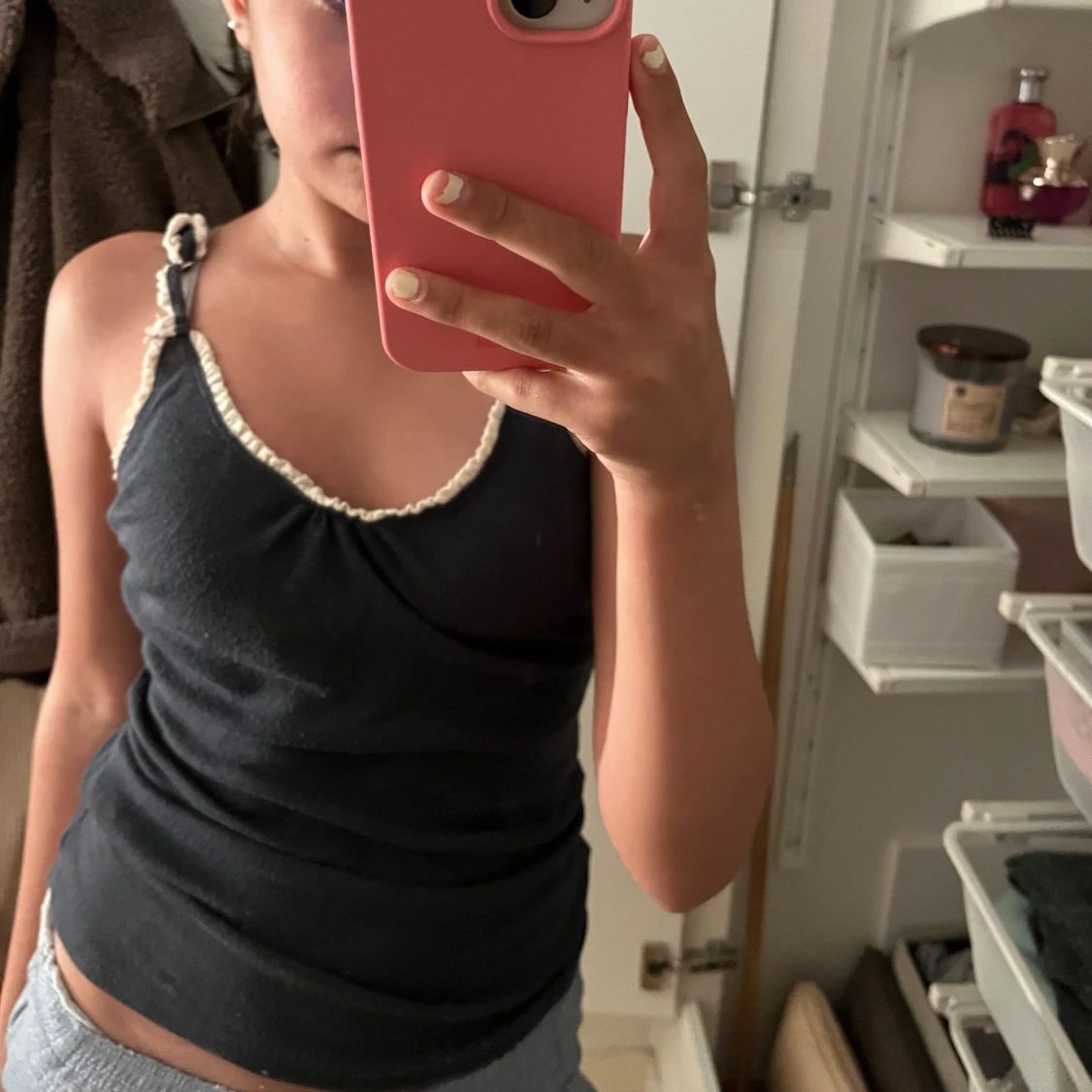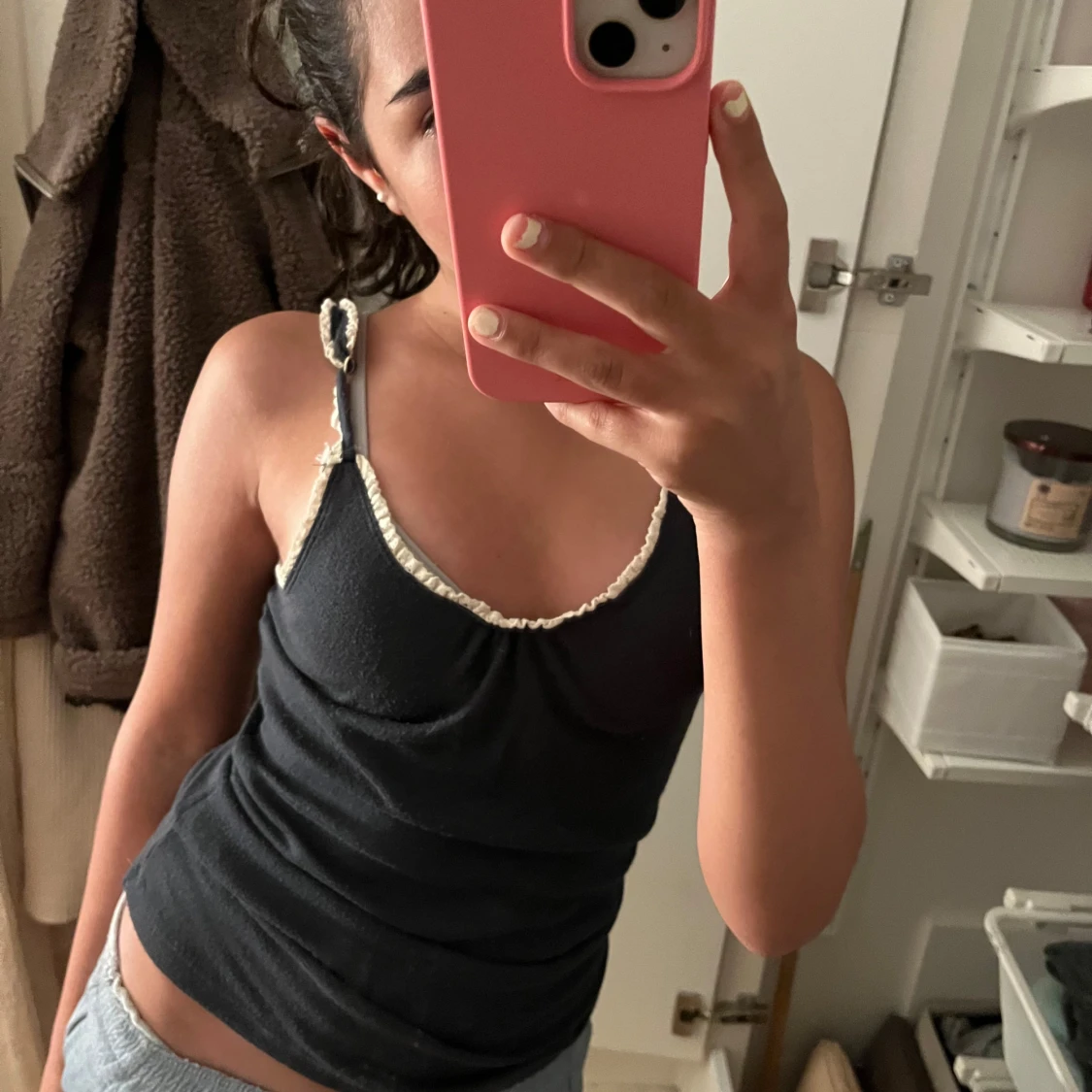 Supersöt marinblå linnetopp med smala axelband och vit volangkant! hittar ingen storlek på den men skulle säga runt xxs-s. jag har vanligtvis xxs i storlek och denna är lös på mig. så den hade varit tajtare på nån som har S!