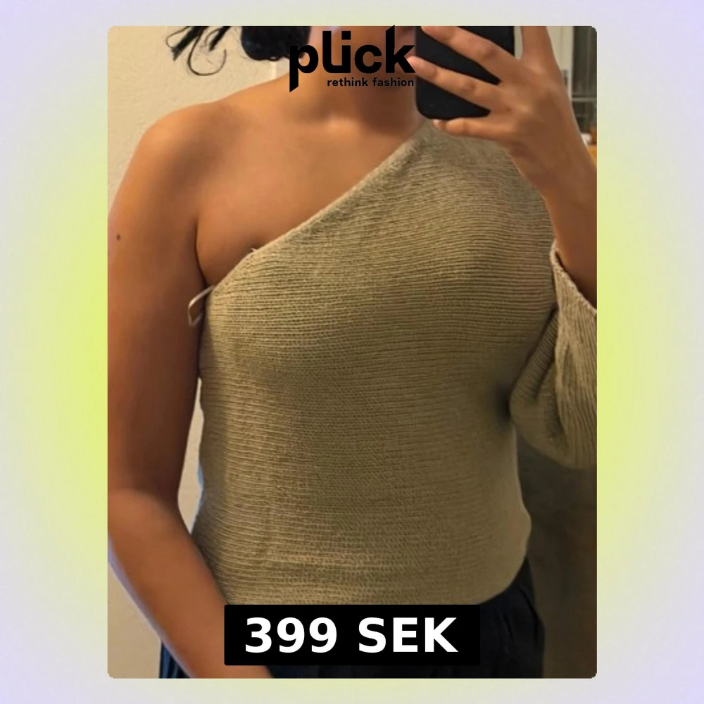 Säljer en beige stickad topp med oneshoulder-design och lång ärm på ena sidan. Toppen har en avslappnad passform och är perfekt för dig som gillar en unik och trendig look. Materialet är mjukt och ger en skön känsla mot huden.