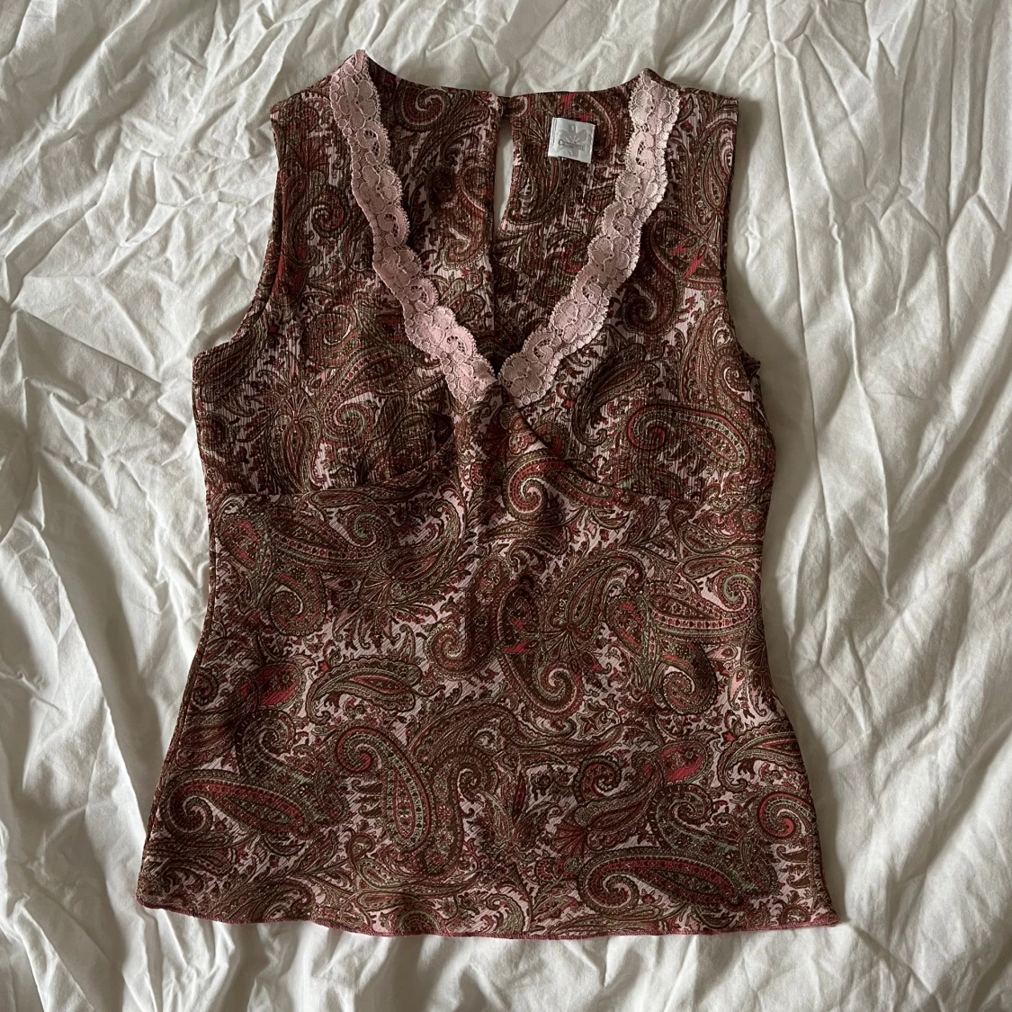 Topp med paisleymönster och rosa spetsdetaljer. Storlek S