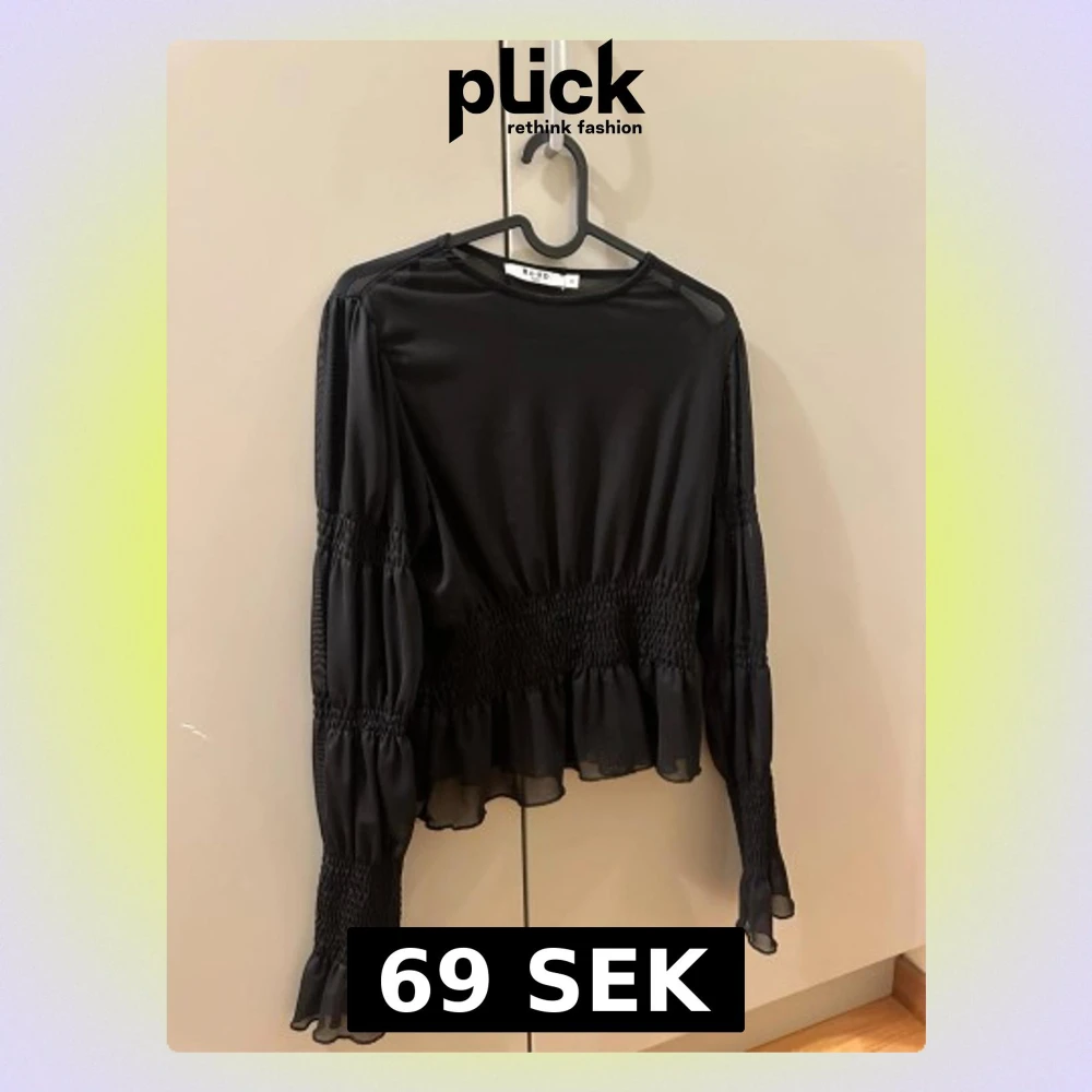 Säljer en svart blus från NA-KD i storlek XS. Blusen har långa ärmar med smock och volangdetaljer vid ärmslut och midja. Materialet är lätt och transparent mesh som ger en luftig känsla. Perfekt för dig som gillar romantiska detaljer och stilren look.