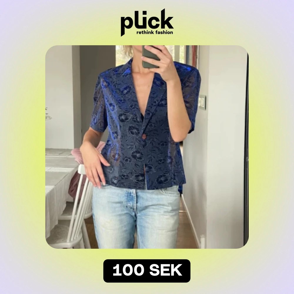 Blå, skimrande topp köpt second hand. Står inte storlek men sitter oversized på mig som har S annars.