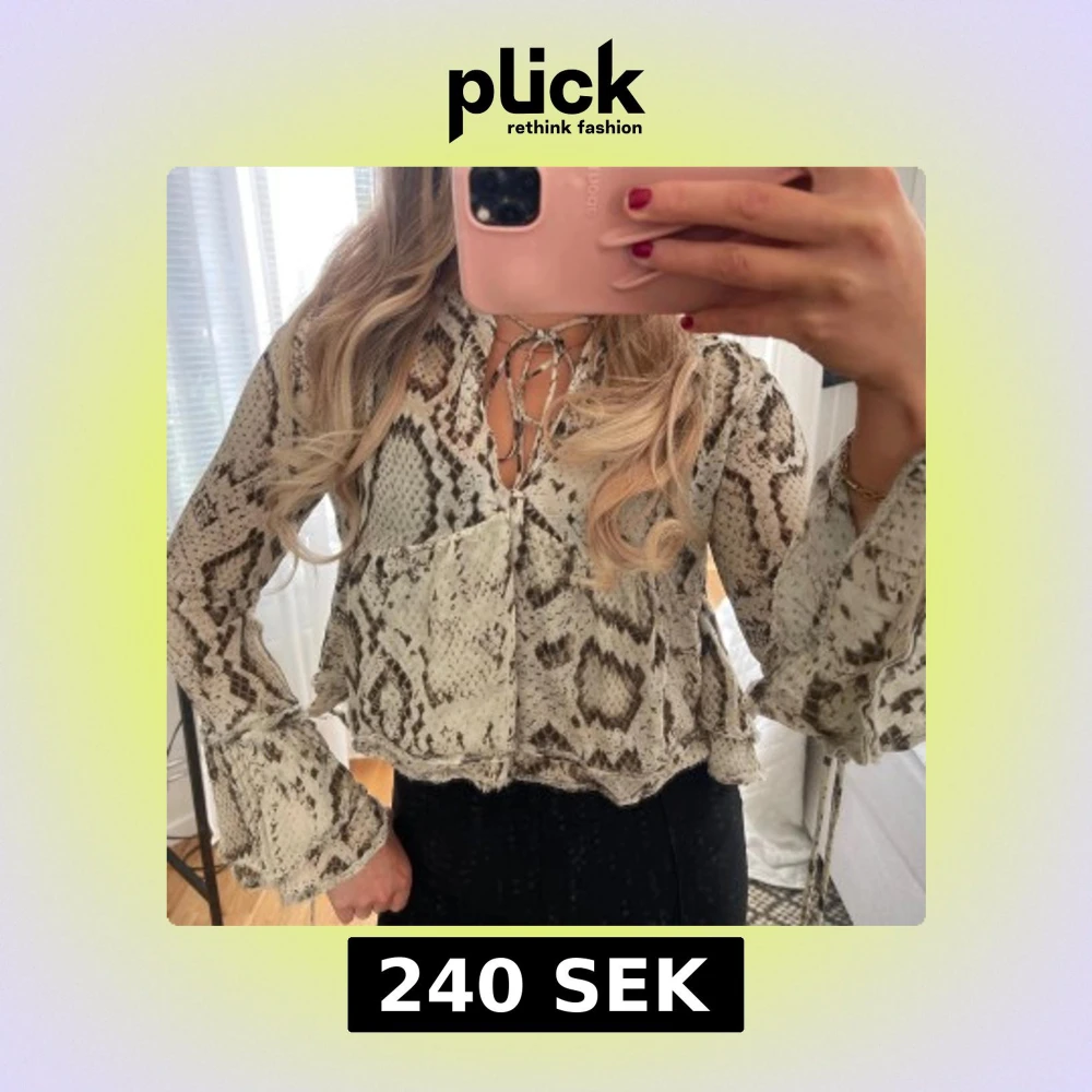 Slutsåld populär blus i mesh från Zara med ormskinnsmönster i beige och brunt. Blusen har långa, vida ärmar med volang och knyt vid ärmslut samt knytning vid halsen. Materialet är lätt och luftigt. Använd en gång.