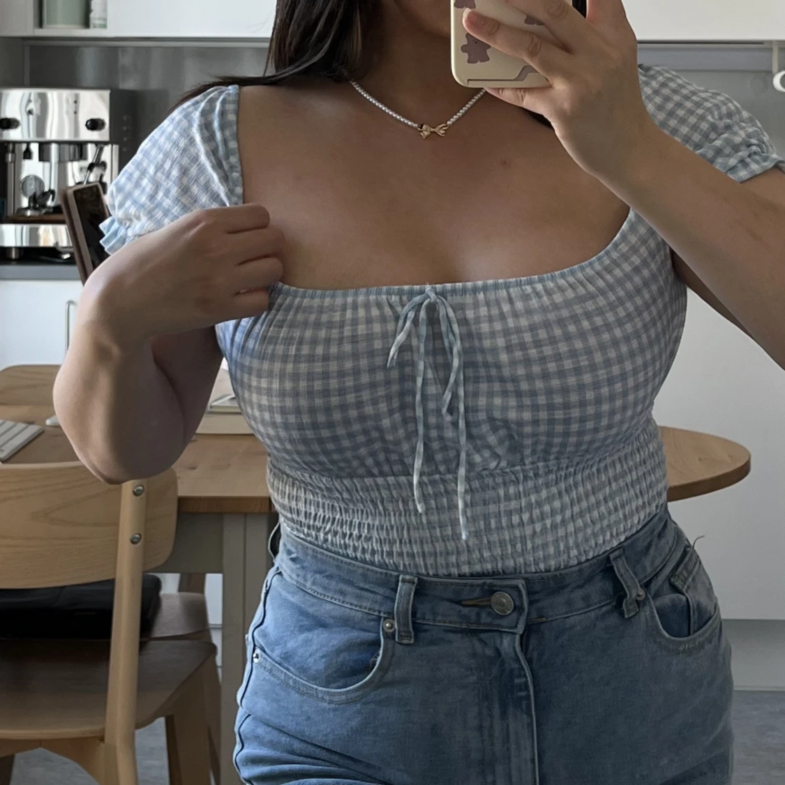 gullig blårutig milkmaid topp 💙materialet är stretchigt och mjuk, fin on- och off shoulder