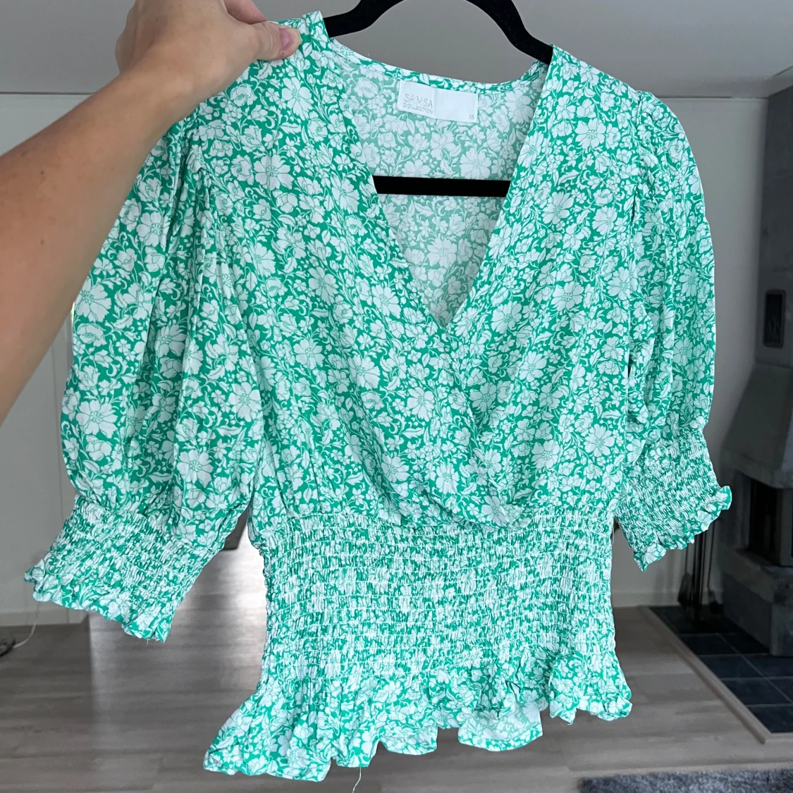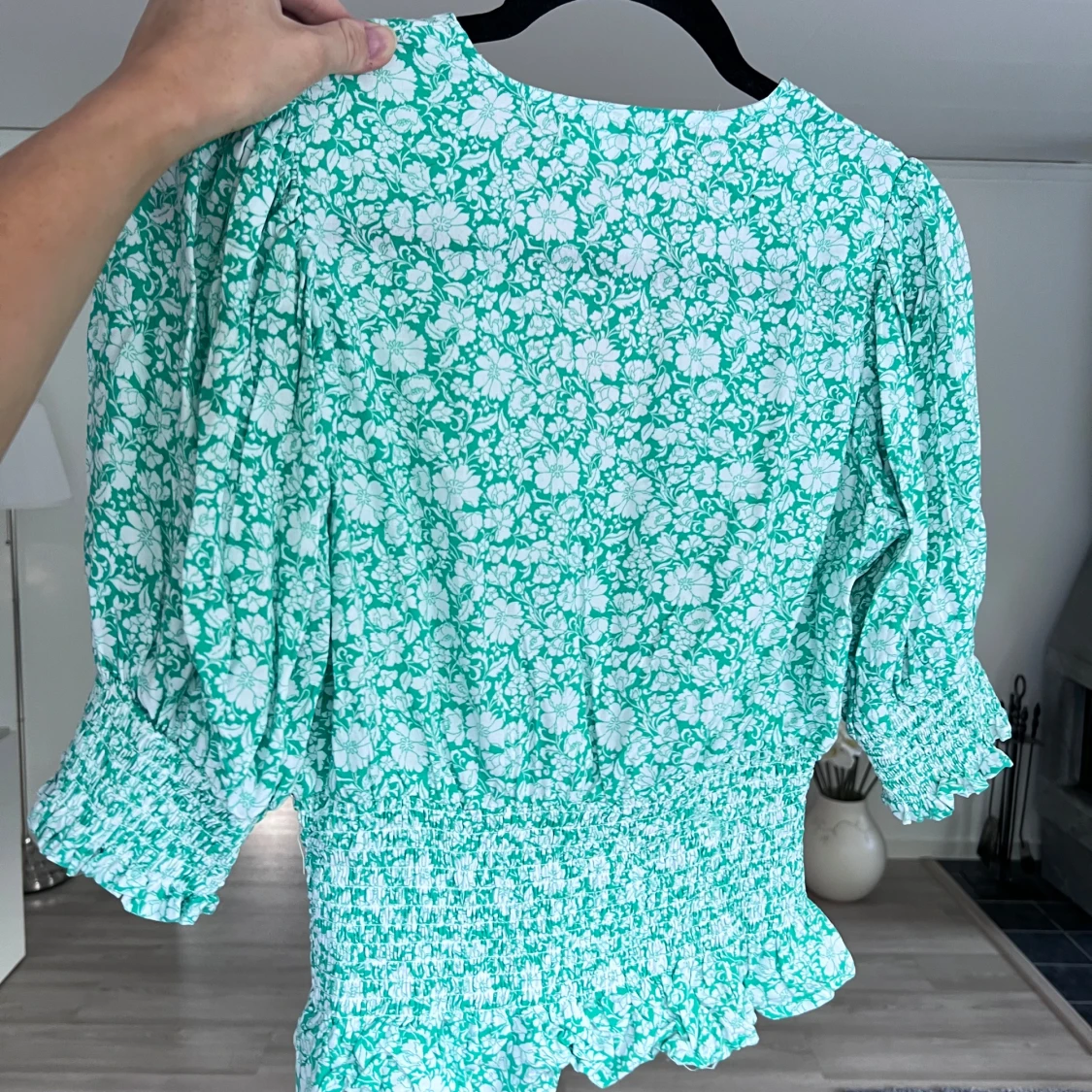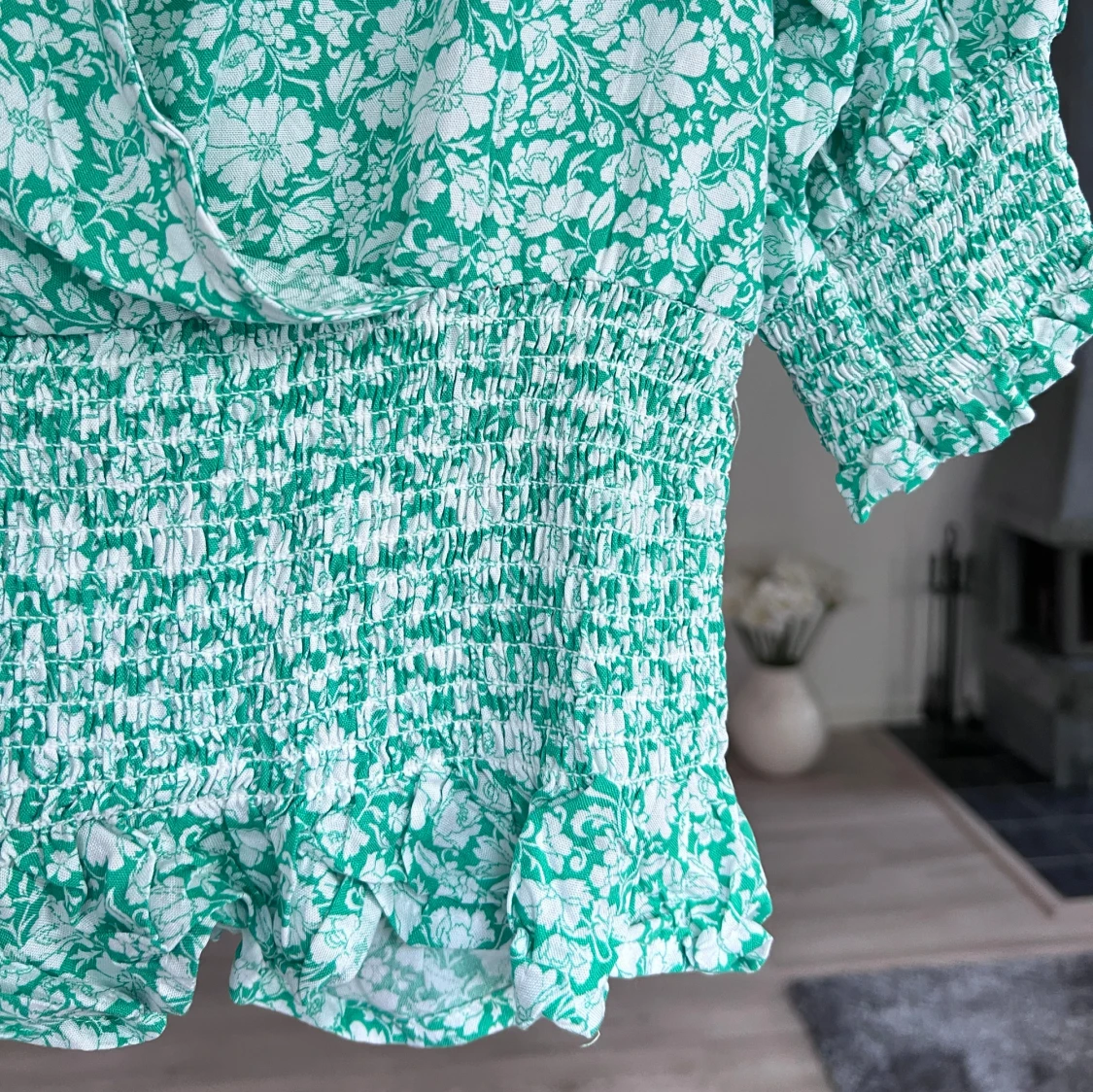 Supersöt blommig blus i mintgrönt och vitt. Omlottmodell med v-ringning, puffiga trekvartsärmar och smockad midja som ger en snygg siluett. Volangdetaljer vid ärmslut och nederkant för extra vibe. Perfekt för vår och sommar! 💚 Önskar du veta exakta mått? Tveka inte att höra av dig!
