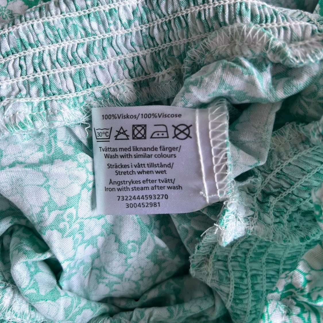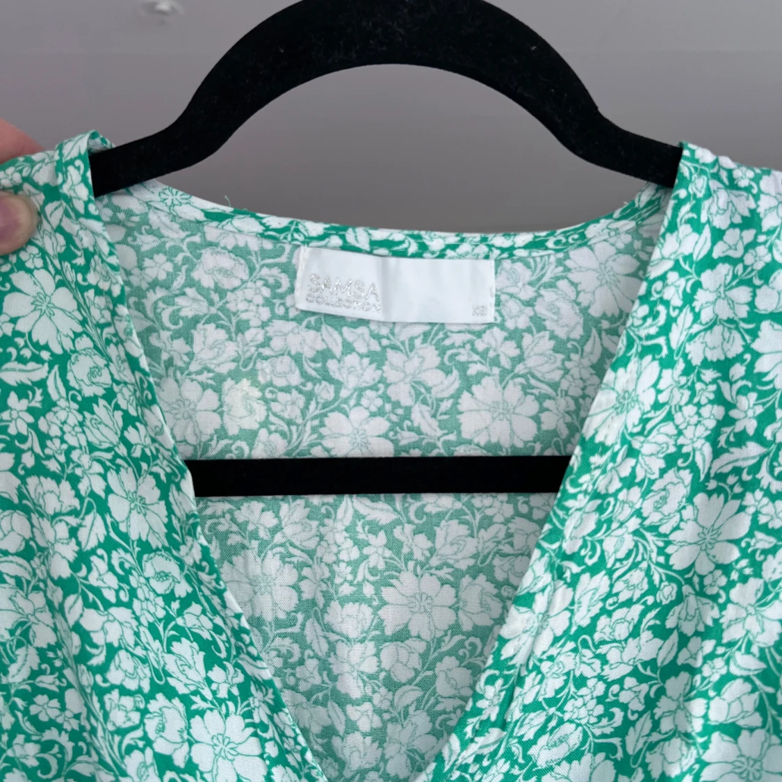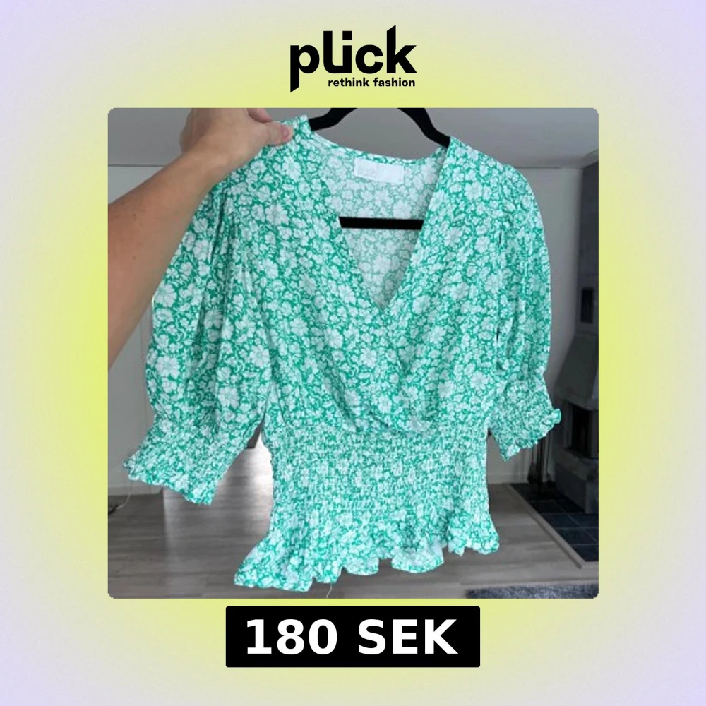 Supersöt blommig blus i mintgrönt och vitt. Omlottmodell med v-ringning, puffiga trekvartsärmar och smockad midja som ger en snygg siluett. Volangdetaljer vid ärmslut och nederkant för extra vibe. Perfekt för vår och sommar! 💚 Önskar du veta exakta mått? Tveka inte att höra av dig!
