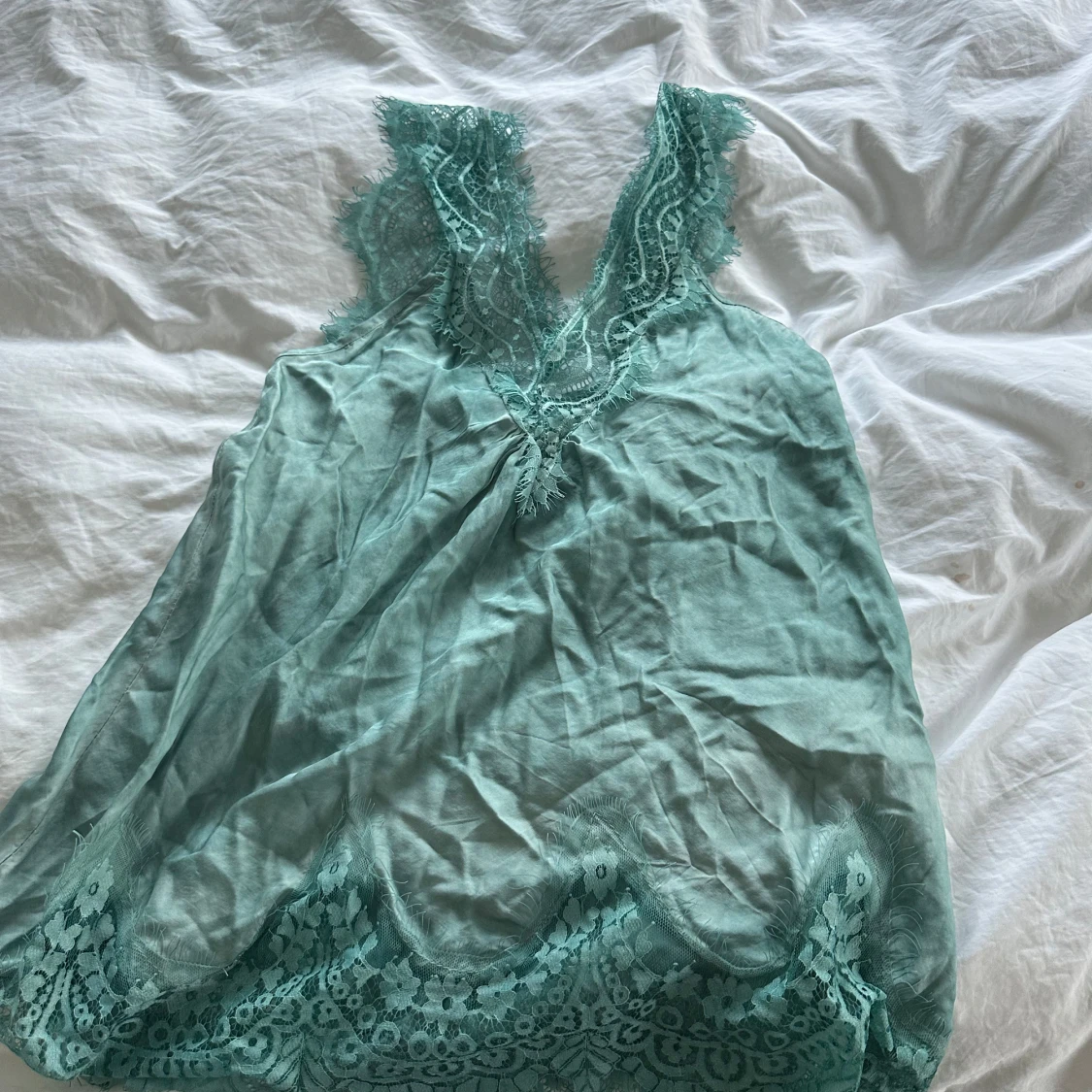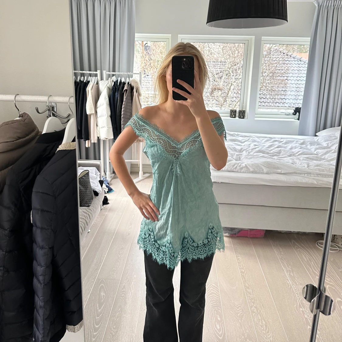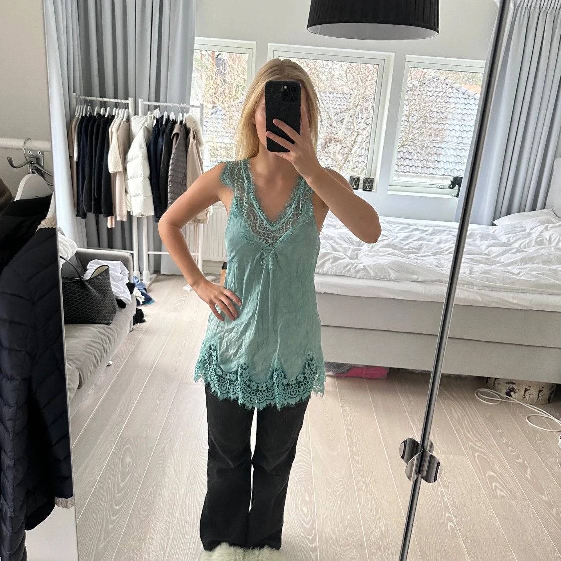 Säljer ett mintgrönt linne med vacker spetsdetalj längs kanterna. Linnet har en lös passform och är ärmlöst med en djup v-ringning. Man kan ha den på flera olika sätt, off shoulder eller vanligt. Så skönt material. Ingen storlek men uppskattar till S