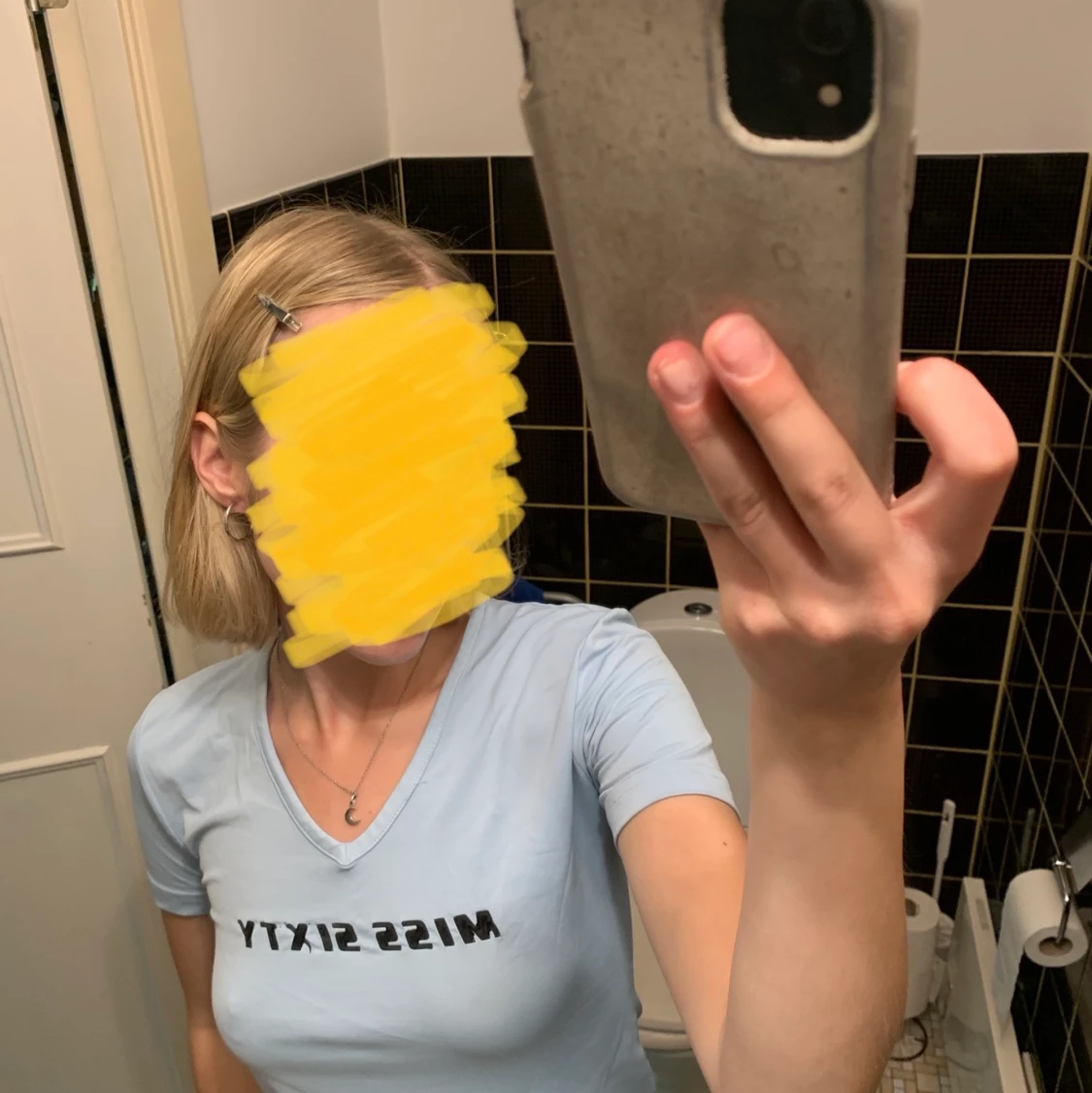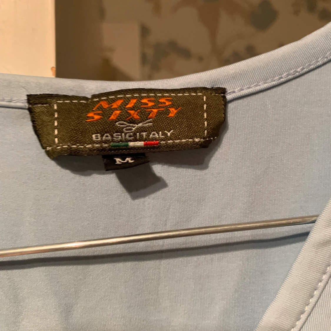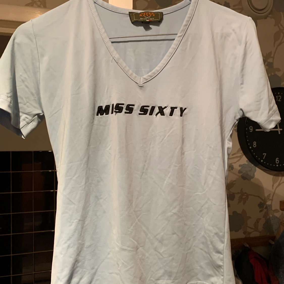 En ljusblå ”Miss Sixty” tröja i ren y2k fashion💗 Storleken säger M men passar mig som är en S! Second-hand thriftad tröja, därav de fragila svarta bokstäverna som är fastklistrade🙏