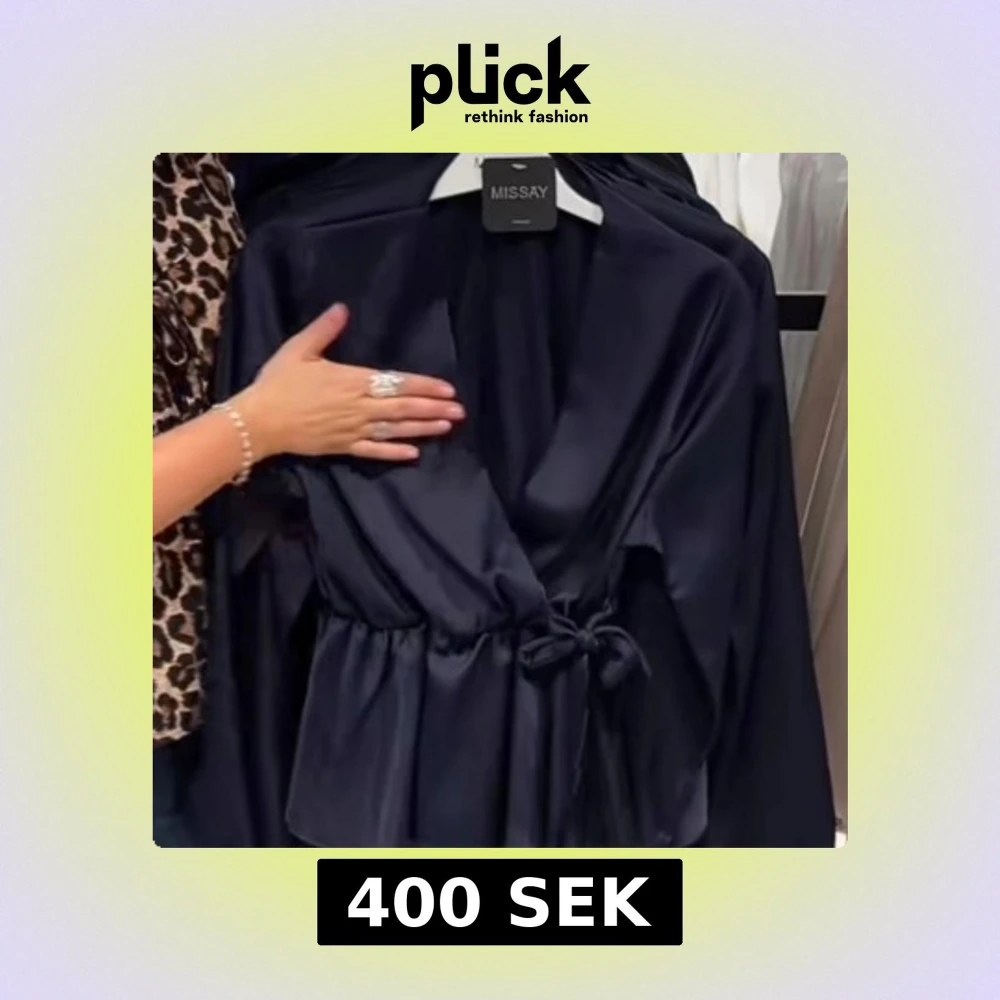 Snygg marinblå omlottblus från Missäy i glansigt satinmaterial. Blusen har långa ärmar, v-ringad hals och knyt i midjan. Perfekt att styla med jeans eller kjol.