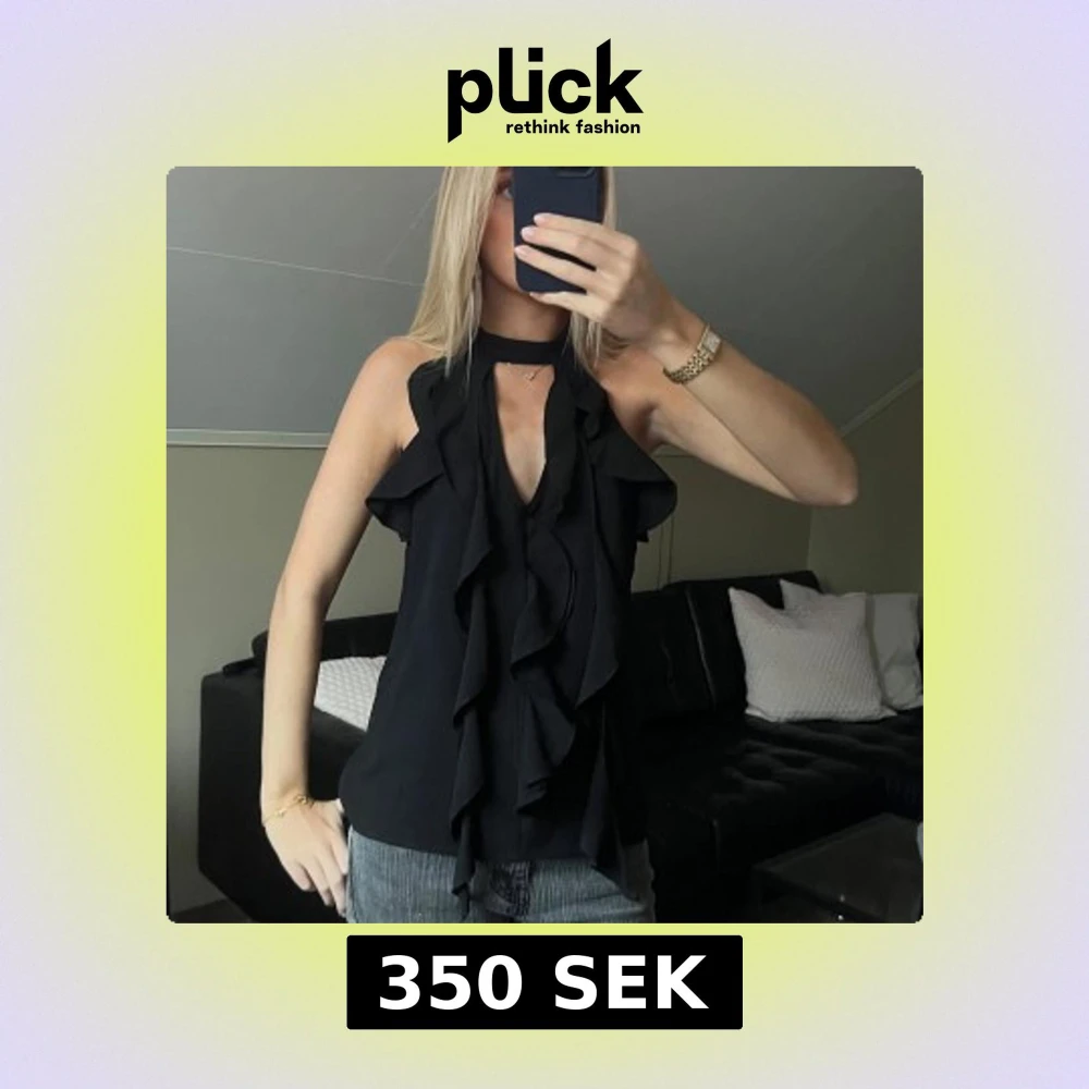 Snygg svart blus med volangdetaljer framtill och en elegant öppen hals. Säljer då den är för stor, toppen är från Missay.