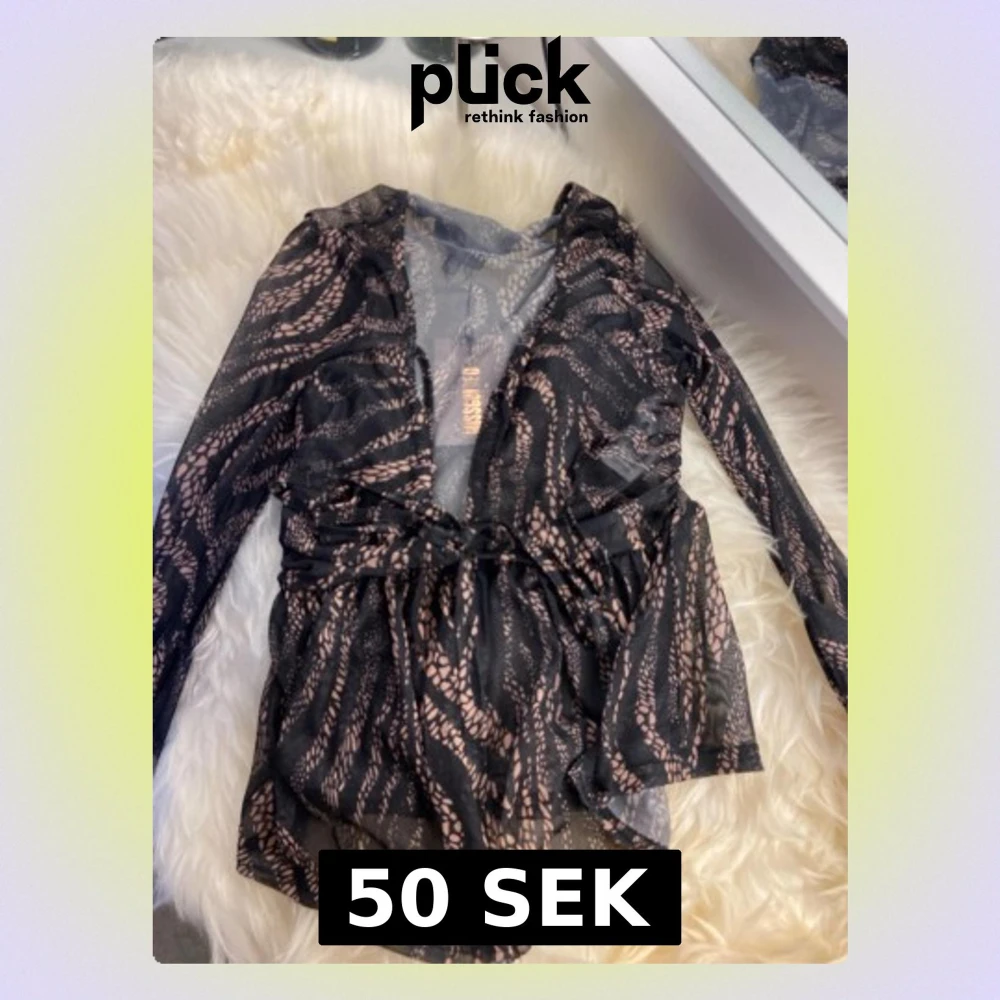 Snygg svart meshblus från Missguided med beige mönster och omlott-design. Blusen har v-ringning, långa ärmar och knytband i midjan. Materialet är genomskinligt och ger en trendig look.