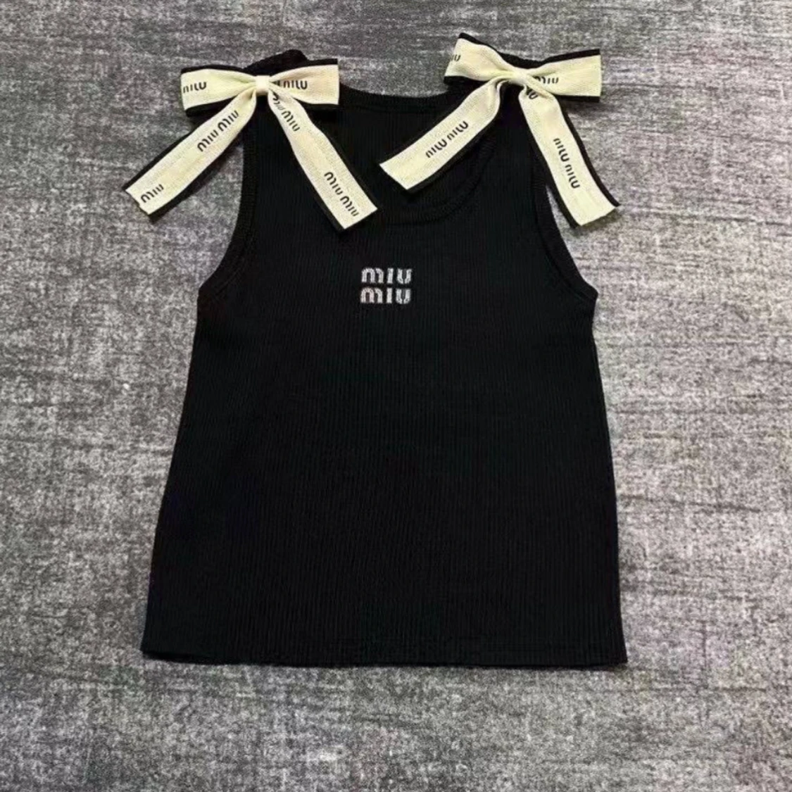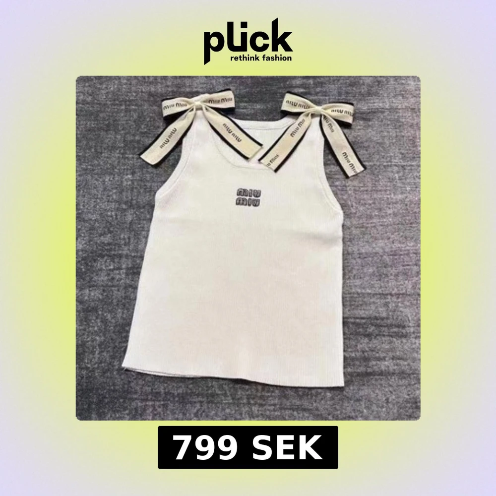 Säljer två ribbade linnetoppar från Miu Miu, en i vit och en i svart. Båda har breda axelband med dekorativa rosetter och Miu Miu-logga framtill. Topparna är ärmlösa och har en clean, croppad passform som är perfekt för att lyfta din look.