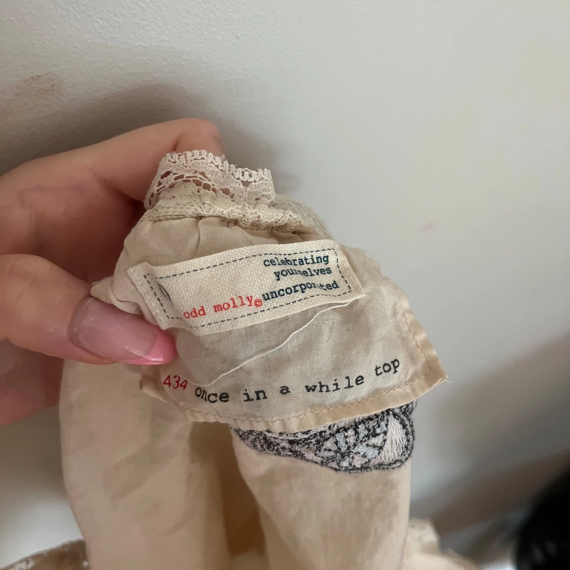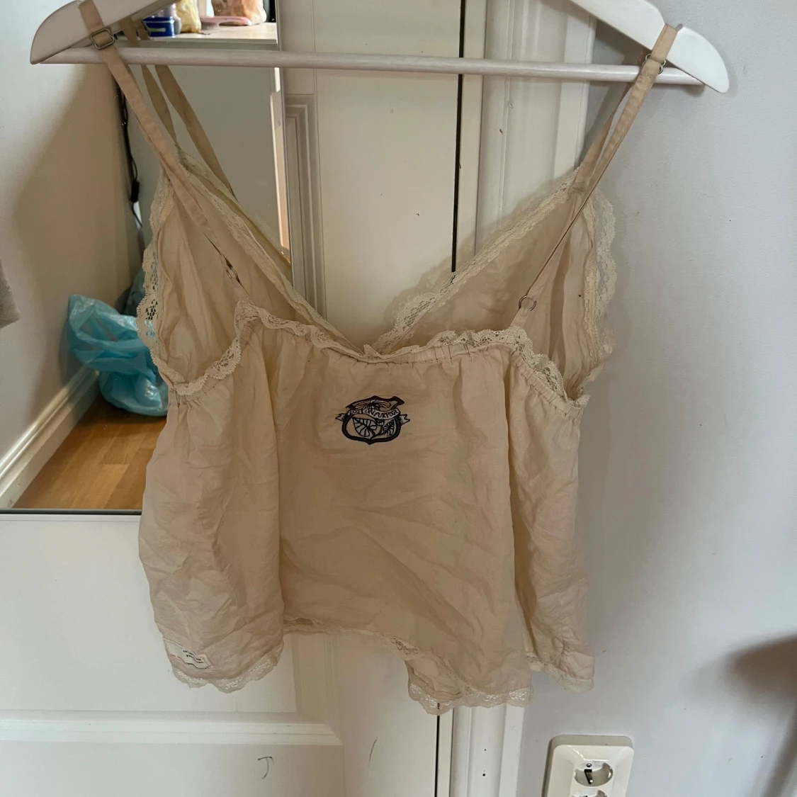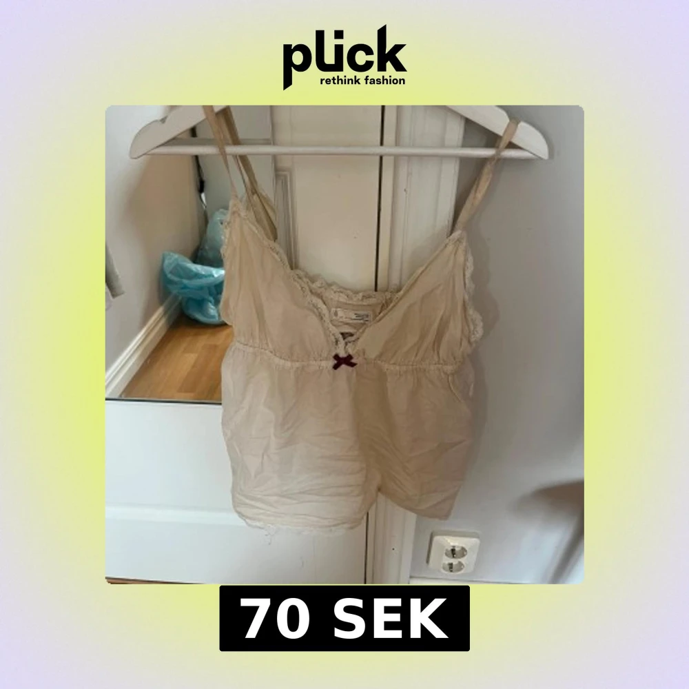Supersöt beige linnetopp från Odd Molly i storlek S, med tunna axelband, spetsdetaljer längs kanterna och en liten vinröd rosett framtill. Broderad logga på ryggen och justerbara axelband. Kommer tyvärr inte till användning.