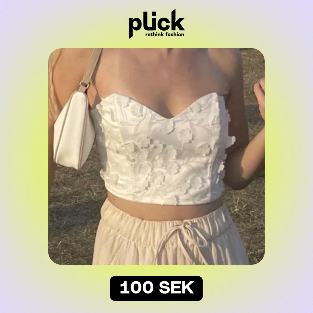 Vit blommig top med 3D-effekt. Har superfin knäppstägning bak. Går att fästa band i hylsor.