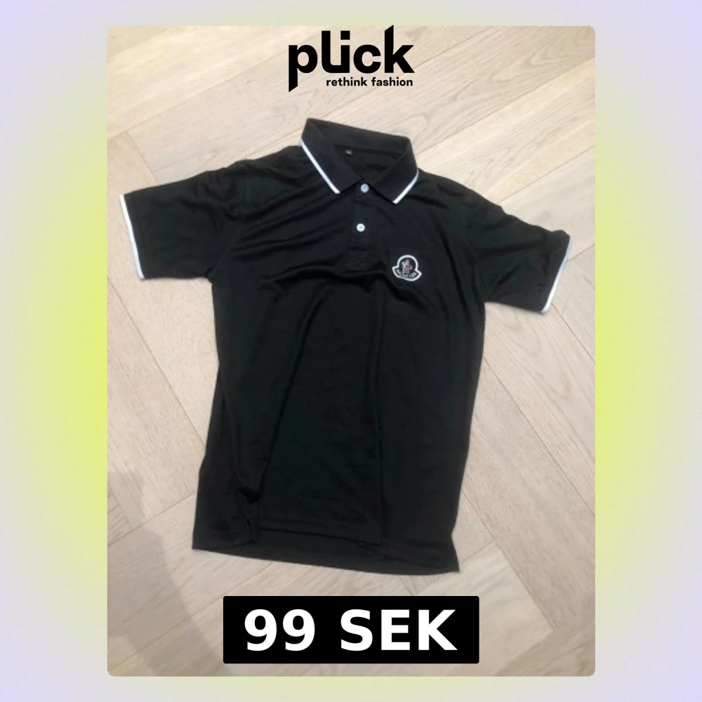 Snygg svart pikétröja från Moncler med vit kant på krage och ärmslut. Klassisk pikéknäppning med två knappar och Moncler-logga broderad på bröstet. Perfekt till jeans eller shorts för en clean och stilren look.