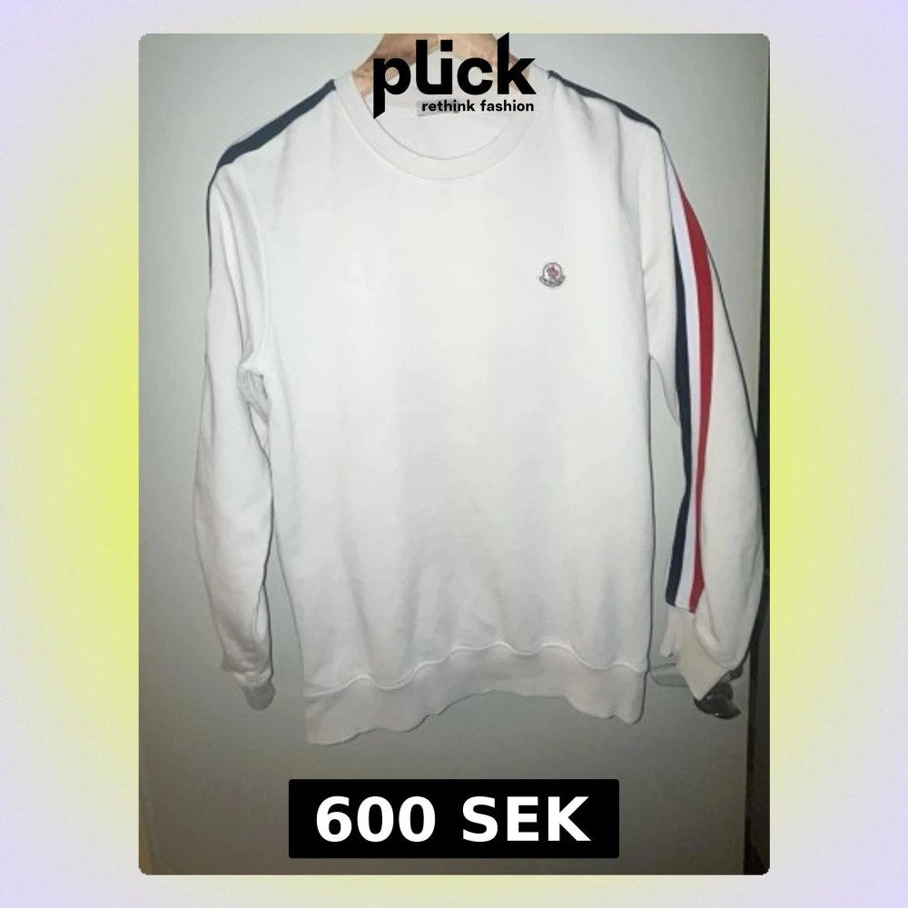 Vit sweatshirt från Moncler med rund hals och långa ärmar. Tröjan har röd och marinblå rand längs ärmarna samt Moncler-logga på bröstet. Tillverkad i mjuk bomull för en bekväm känsla. Perfekt för en sportig och stilren look.
