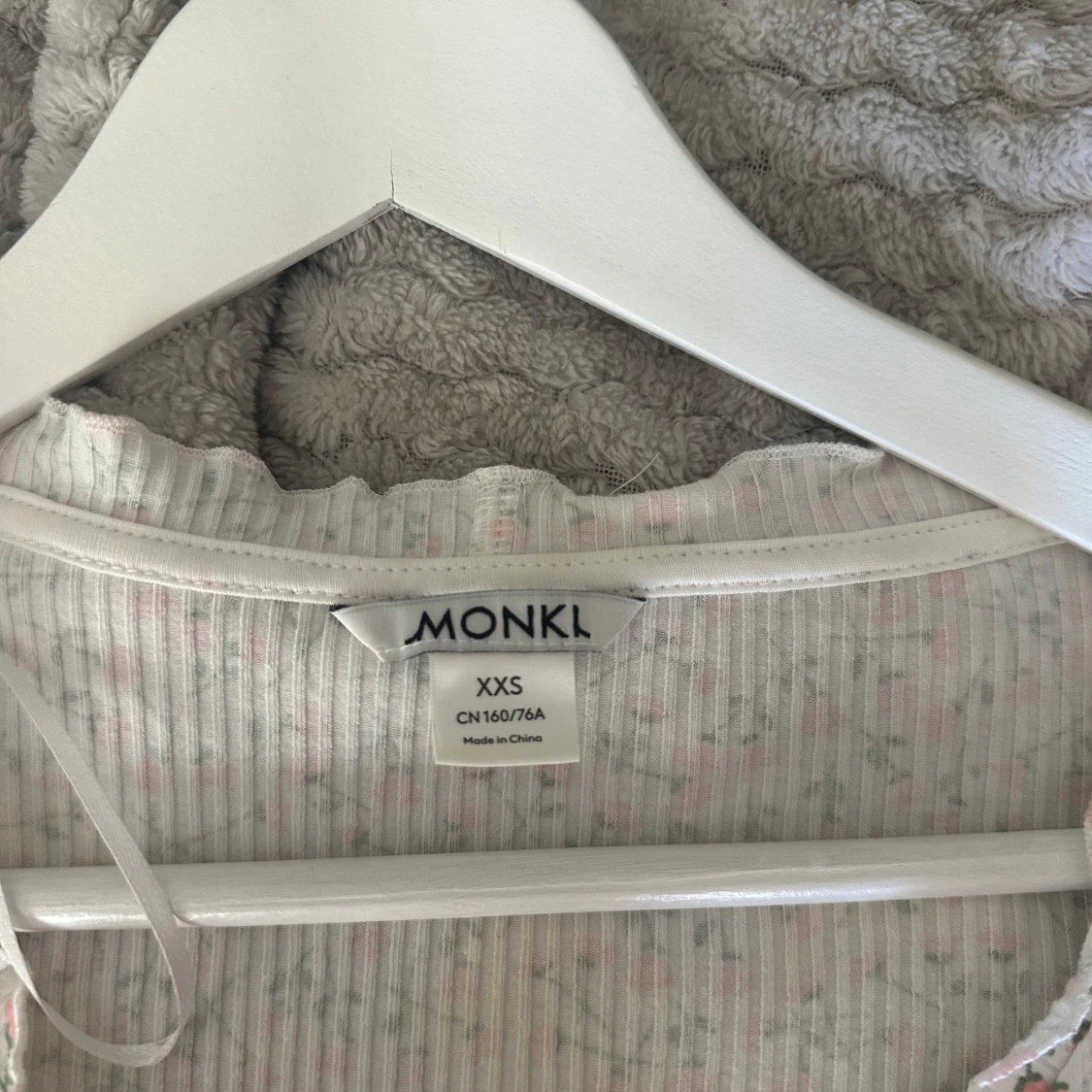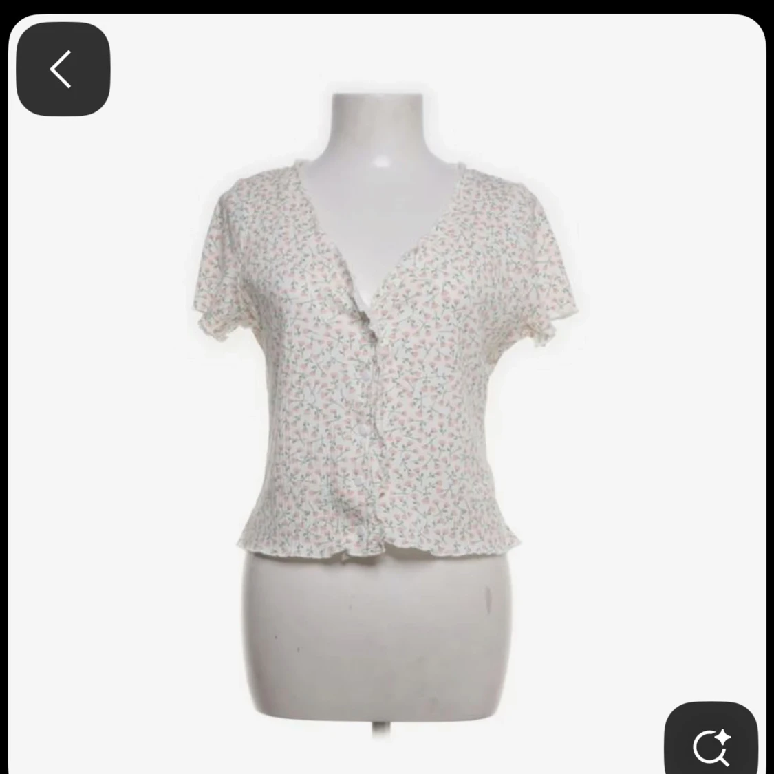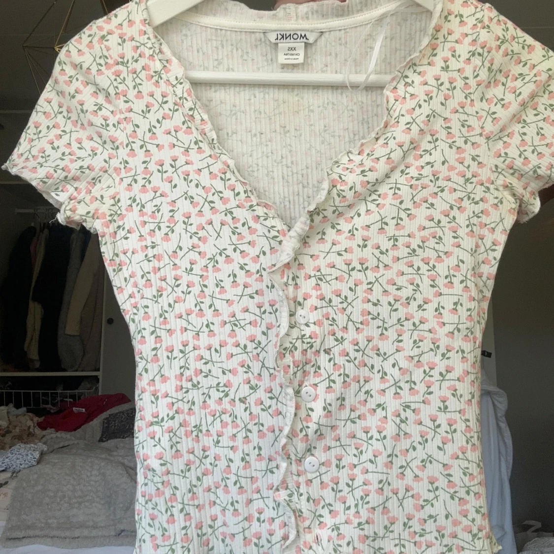Supersöt kortärmad topp från Monki med blommigt mönster i rosa och grönt på vit botten. Toppen är ribbad, har v-ringning och knappar framtill. Perfekt för en fräsch och somrig look!