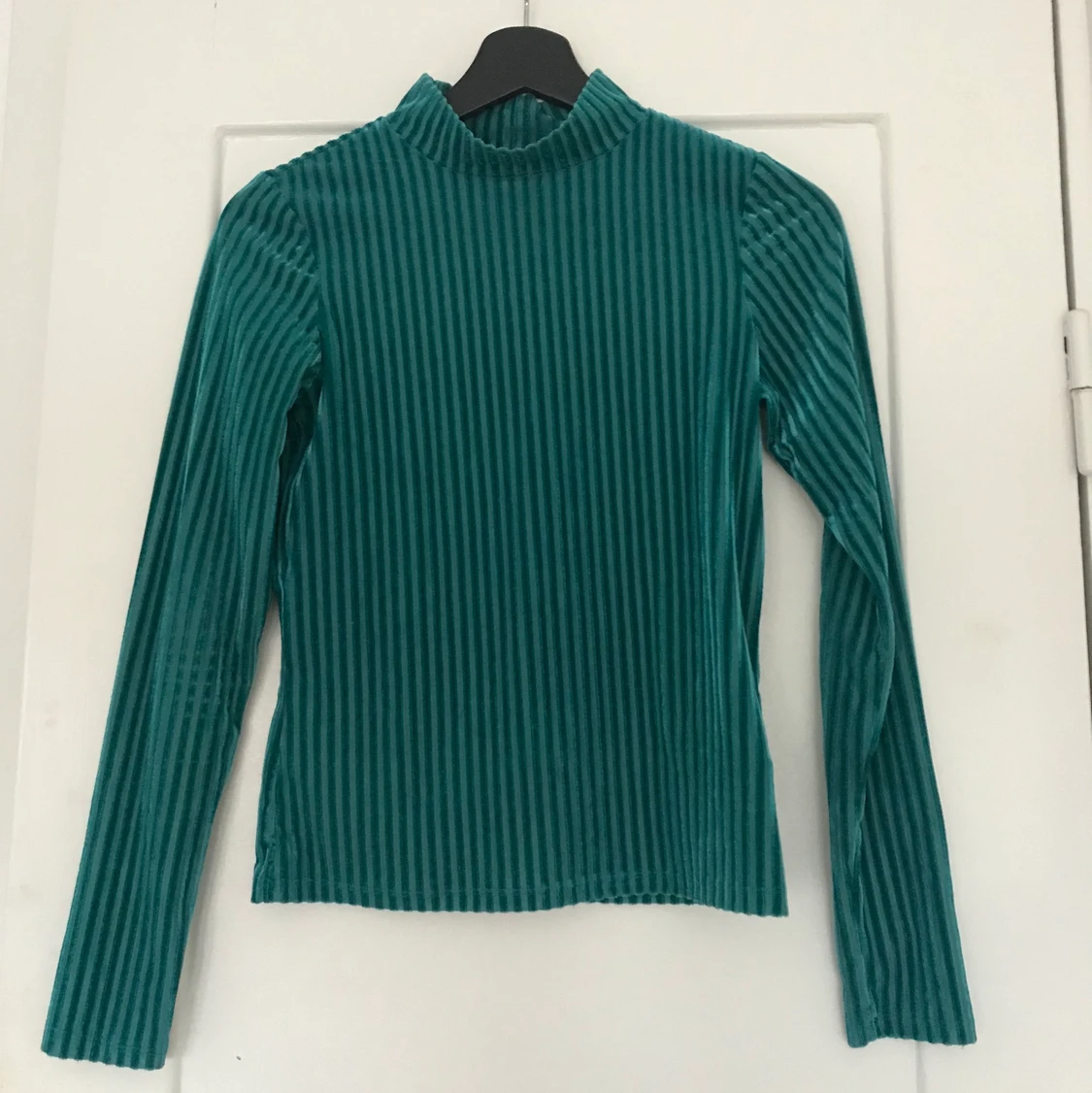 Blågrön polotröja från Monki med ränder i sammet. Storlek xs men passar även s!