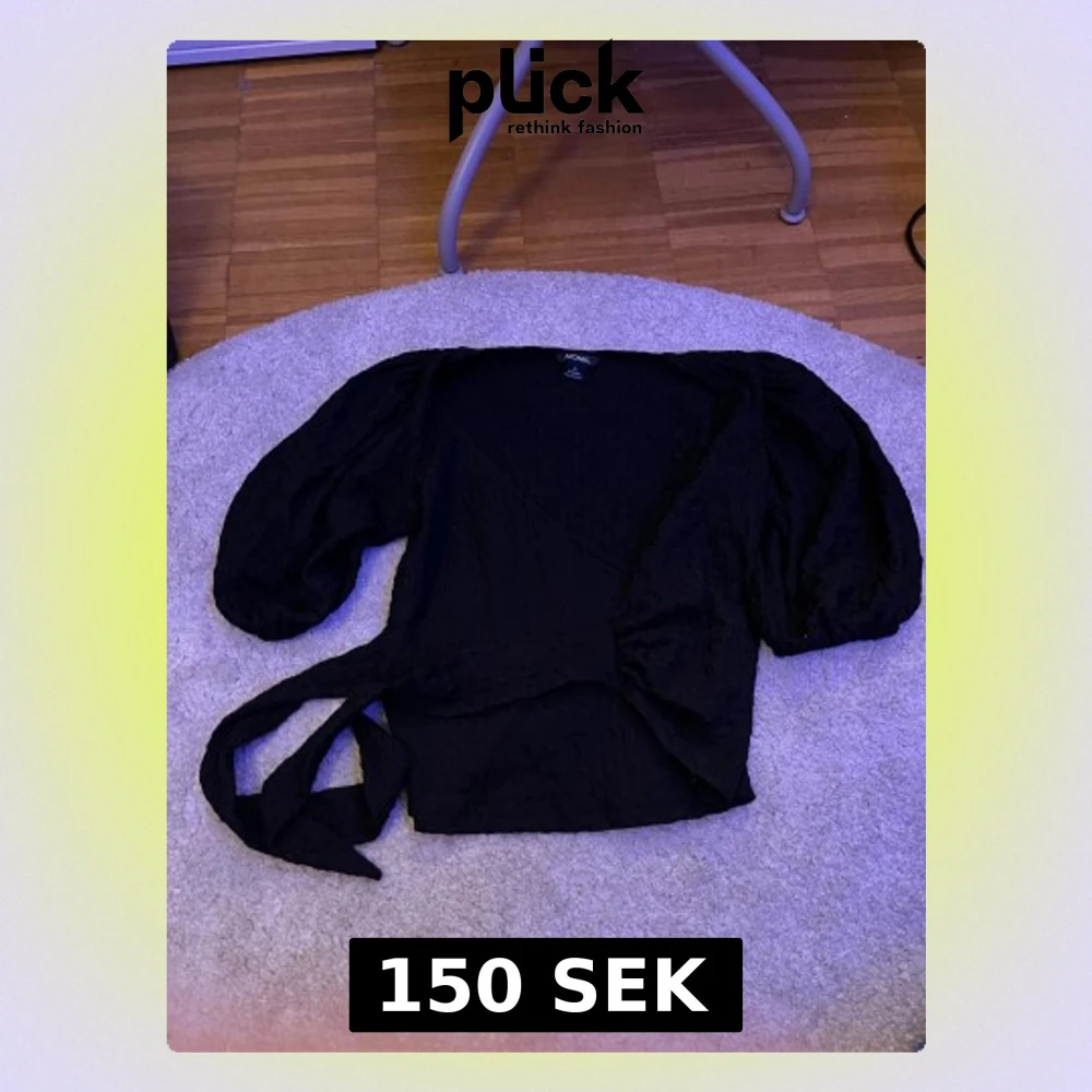 Säljer en svart omlottblus från Monki med puffiga långärmar och knytband i midjan. Blusen har en lätt textur i tyget och v-ringad hals. Perfekt för dig som gillar trendiga detaljer och vill ha en snygg siluett.