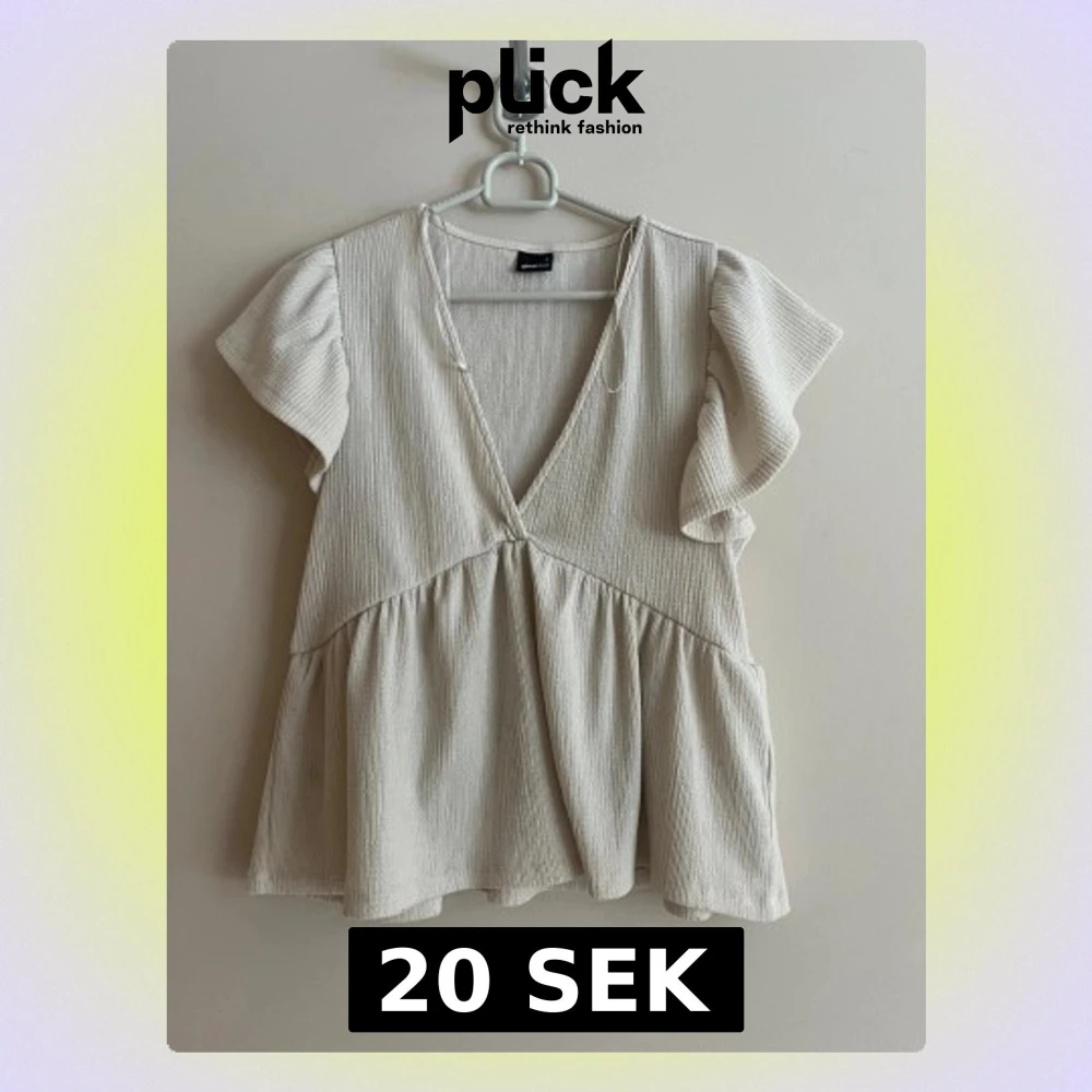 Luftig beige topp med omlott-v-ringning och volangärmar. Tillverkad i ett ribbat material som ger en mjuk struktur. Perfekt för dig som gillar en avslappnad men ändå söt stil.