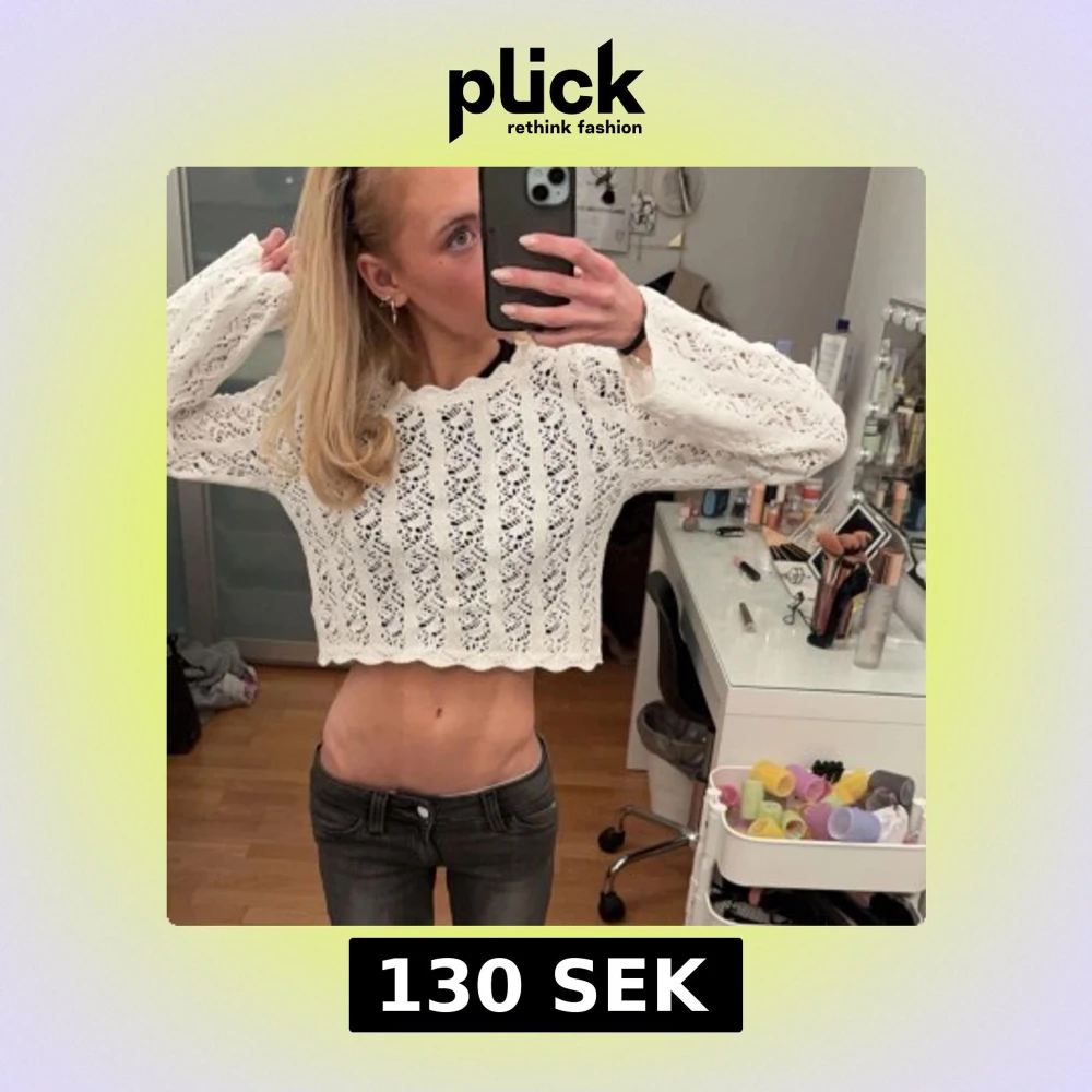 Säljer en söt vit croppad tröja med spetsmönster. Tröjan har långa ärmar och en vågig kant nertill. Perfekt för en stilren och romantisk look.oanvänd
