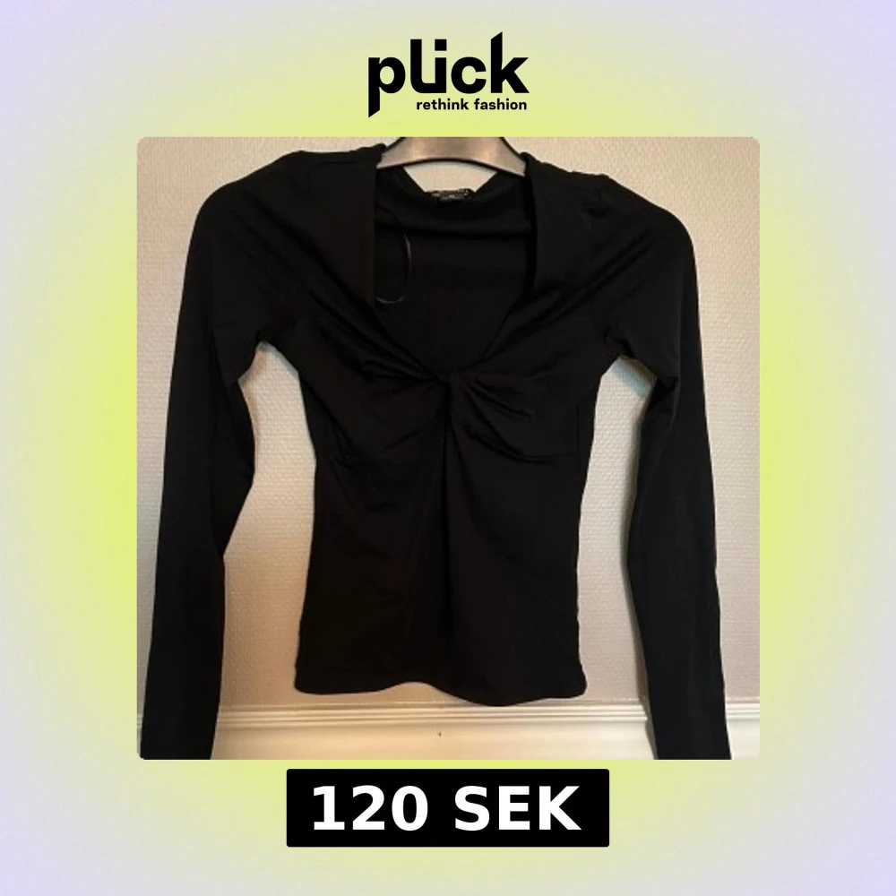 Svart långärmad topp från Monki i storlek XS. Toppen har en snygg twistad detalj framtill vid bysten och djupare urringning. Tillverkad i mjuk bomullsmix, perfekt för att lyfta din outfit med en cool touch.