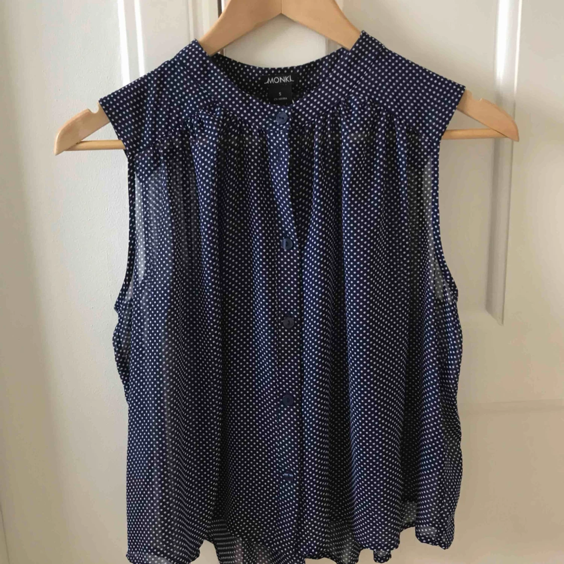 Söt marinblå blus med vita prickar. Aldrig använd med prislapp kvar. Riktigt fin till fest eller vardag!