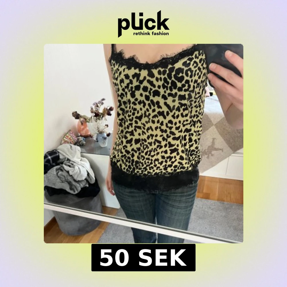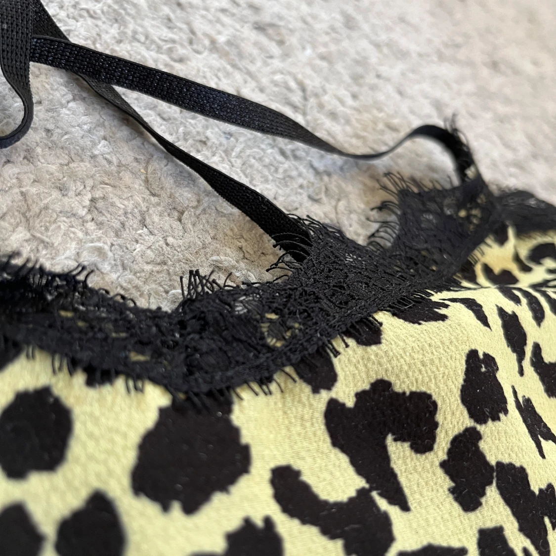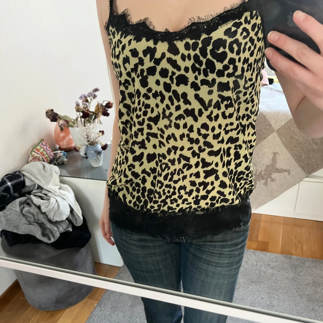 Säljer ett snyggt linne med leopardmönster och svart spets längst ned i kanten och vid bysten. Trendig, snygg passform och somrig. Köpt på Sellpy och lappen var bortklippt men skulle säga S/XS i storlek.