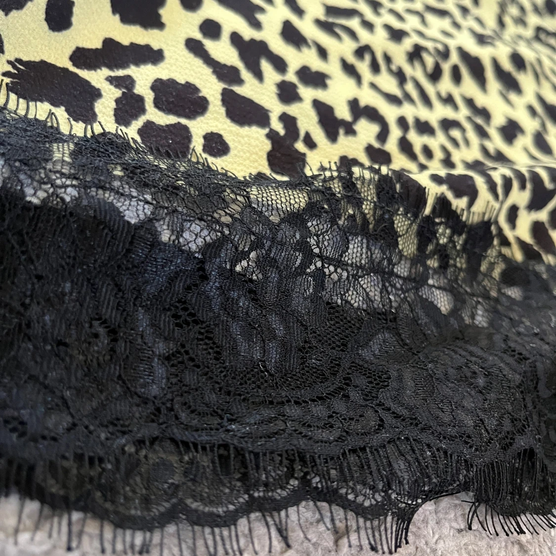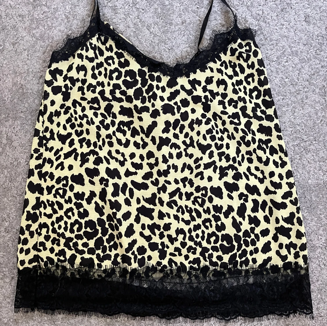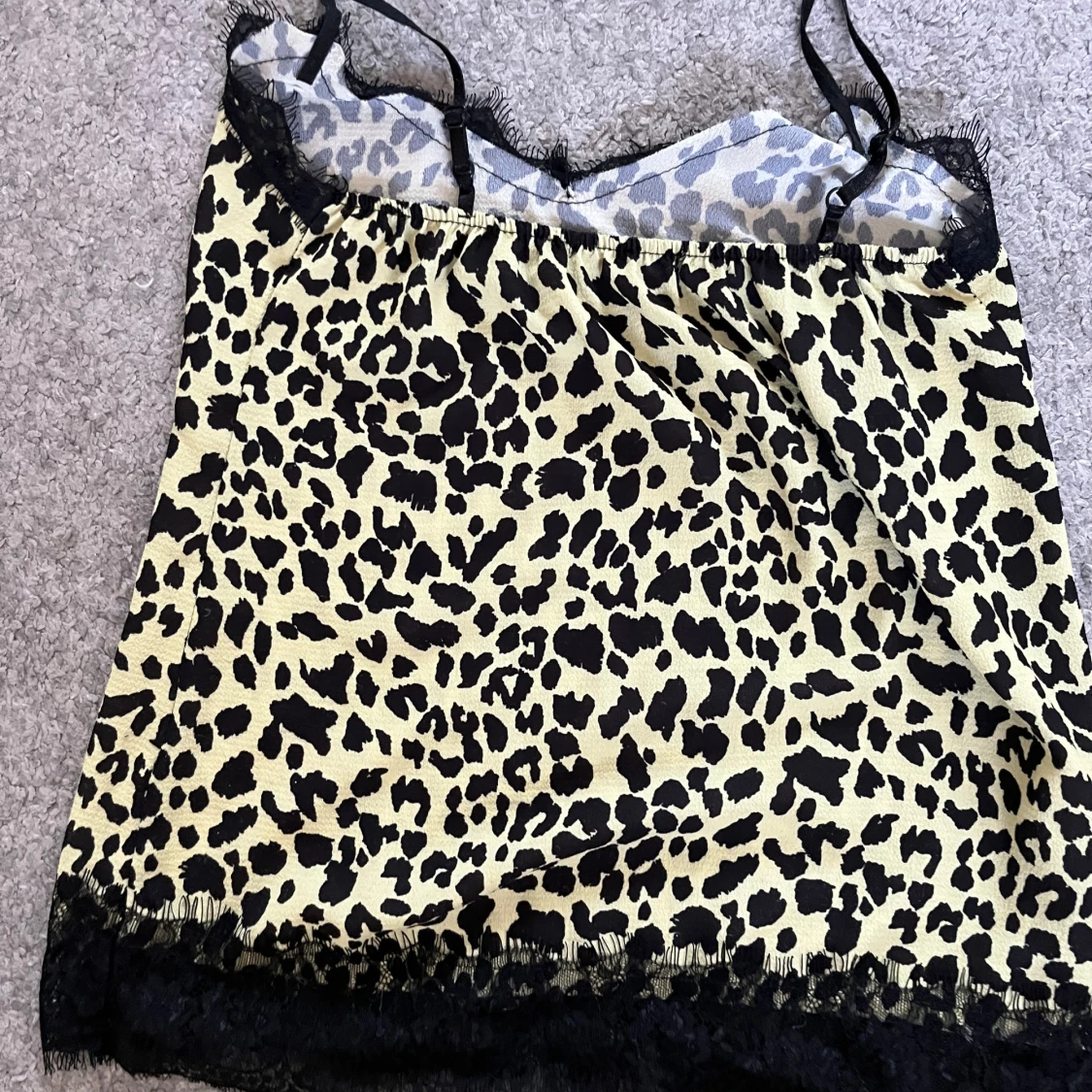 Säljer ett snyggt linne med leopardmönster och svart spets längst ned i kanten och vid bysten. Trendig, snygg passform och somrig. Köpt på Sellpy och lappen var bortklippt men skulle säga S/XS i storlek.