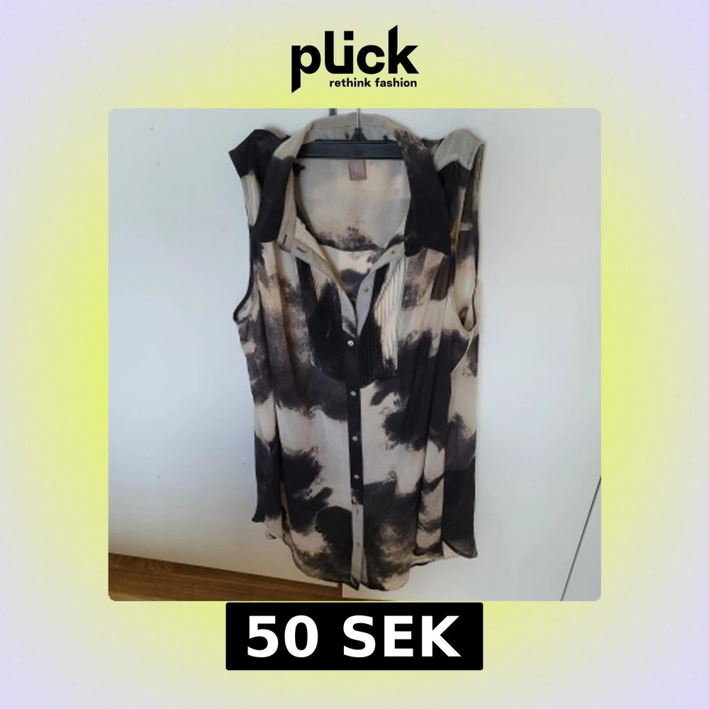 Säljer en unik ärmlös blus med ett abstrakt mönster i svart och beige. Blusen har en klassisk krage och knappar framtill, vilket ger en stilren look. Perfekt för en avslappnad men ändå chic stil.