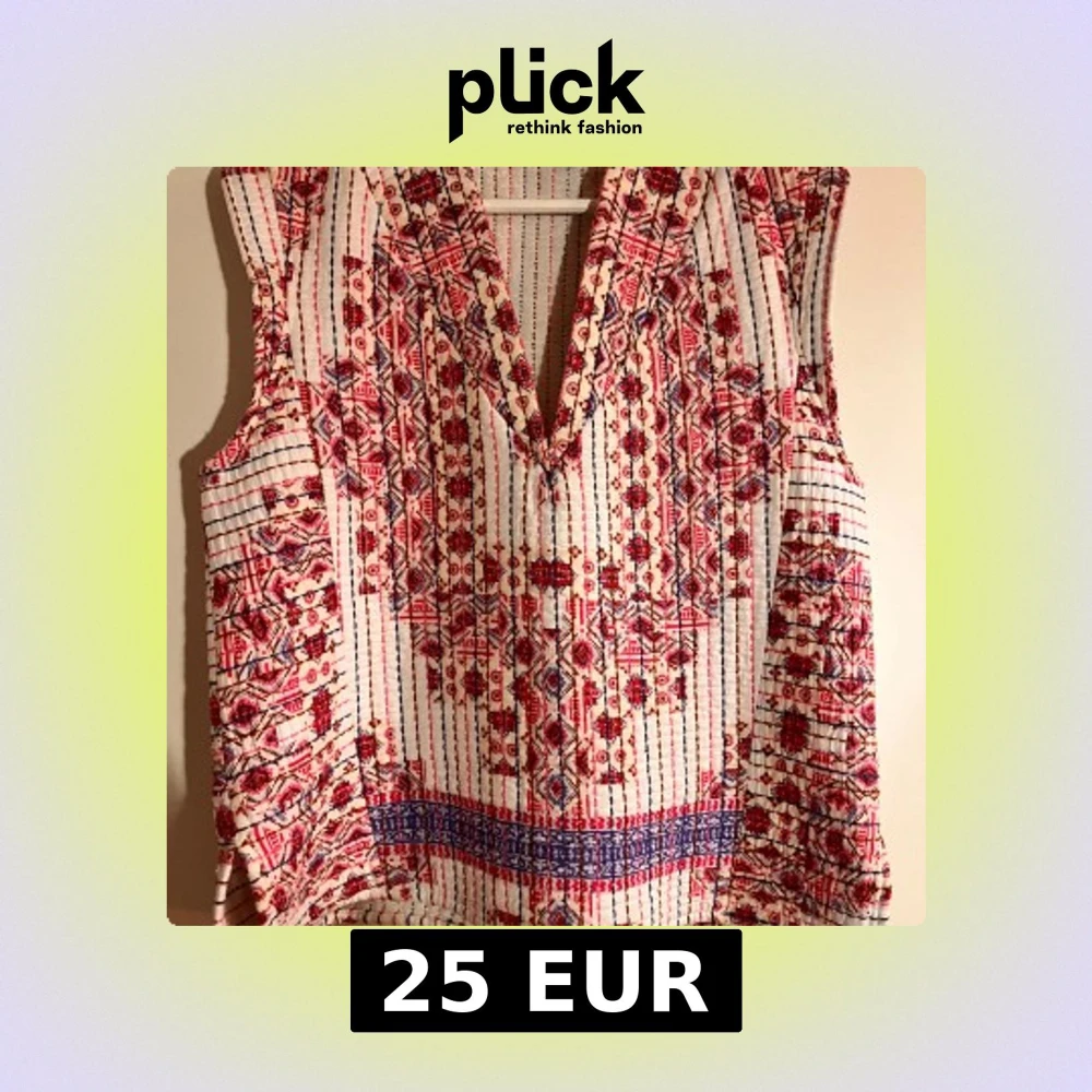 Säljer en ärmlös blus från Zara med v-ringning och färgstarkt mönster i rött, blått och vitt. Blusen har broderade detaljer och ett bohemiskt mönster med inslag av ränder och små blommor. Tillverkad i mjuk bomull, perfekt för varma dagar.