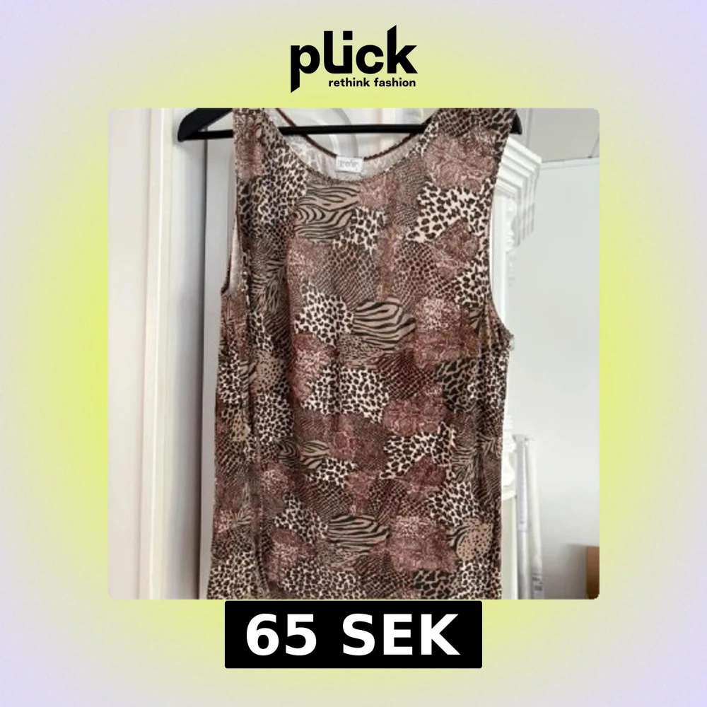 Säljer en ärmlös linnetopp från Trofé med djurmönster i bruna och beige toner. Toppen har rund halsringning och är tillverkad i ett mjukt material, perfekt för varma dagar. Strl L