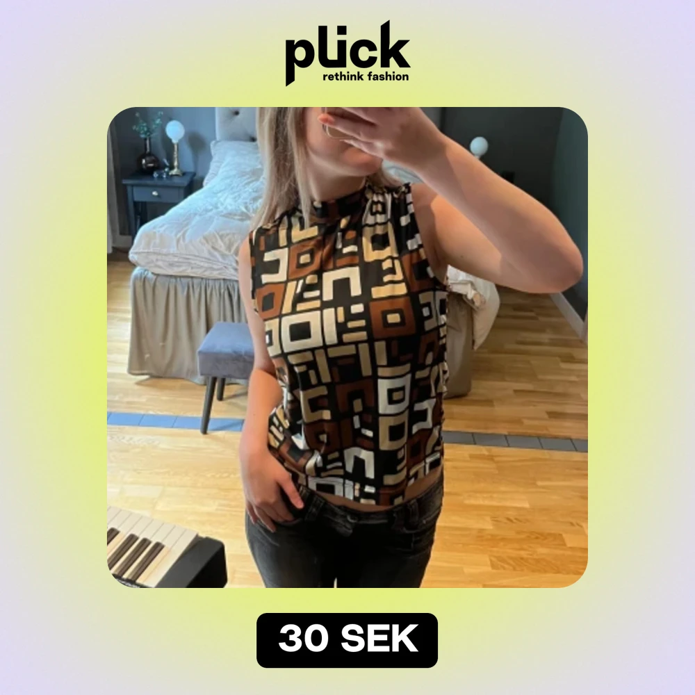 Säljer en cool ärmlös topp från Mexx med ett unikt geometriskt mönster i svart, brunt och beige. Toppen har en hög krage och en knytning i nacken som ger en snygg detalj. Axelbredd: 38 cm och Längd: 62 cm.