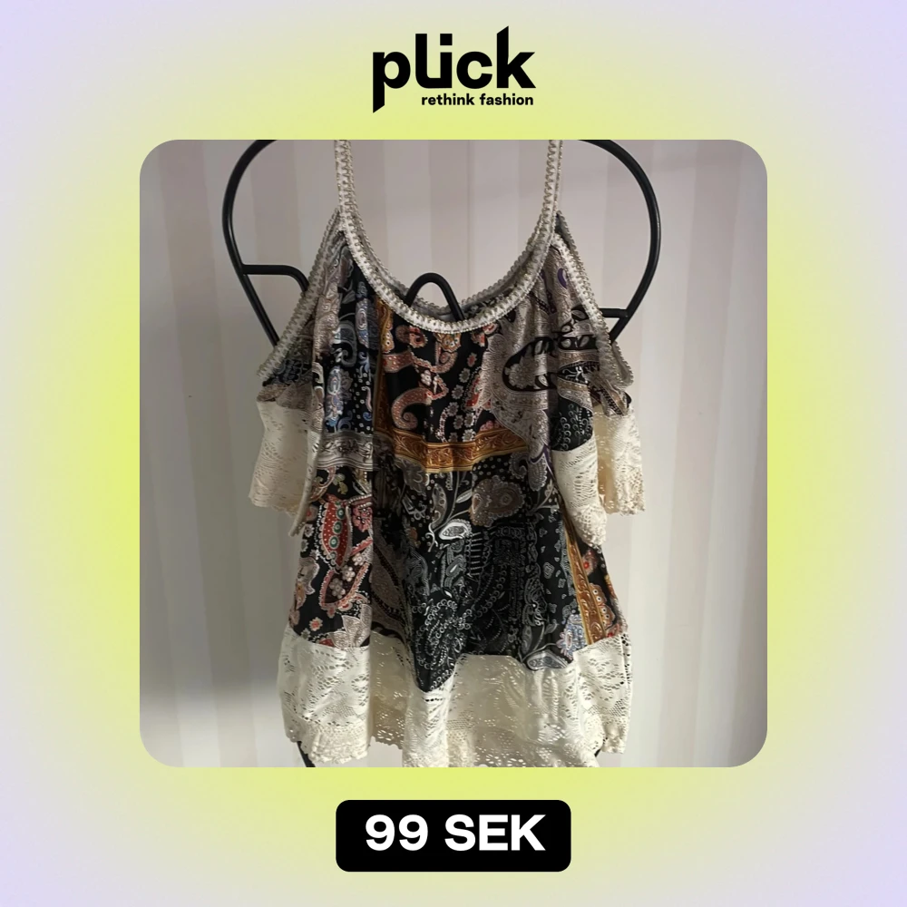 Säljer en unik ärmlös topp med ett färgglatt paisleymönster och vackra spetsdetaljer. Toppen har en luftig passform och tunna axelband, perfekt för sommardagar. Den är tillverkad i Italien och har en bohemisk stil som passar både till vardags och fest.