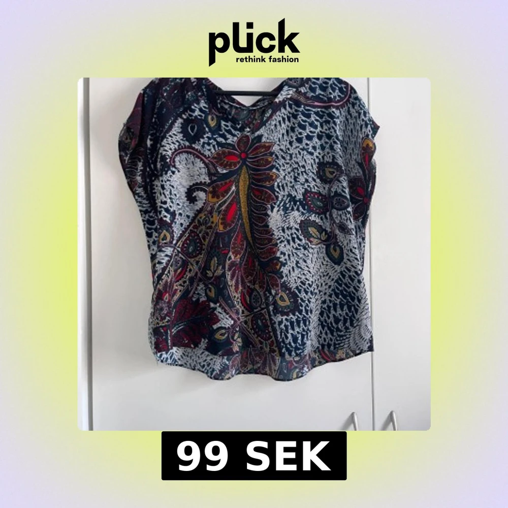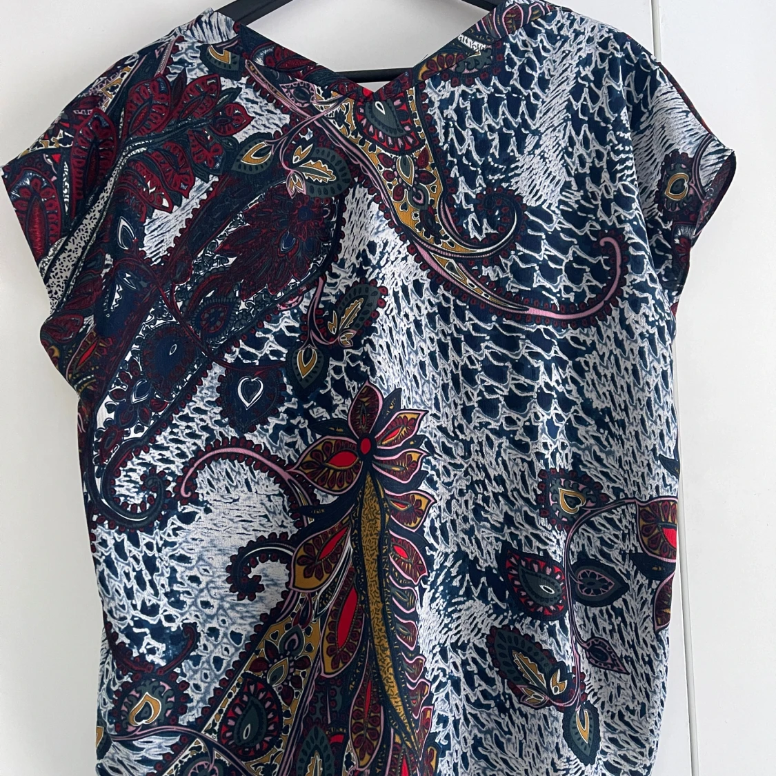 Säljer en färgglad blus med ett unikt blommönster i rött, blått och gult. Blusen har korta ärmar och en lös passform, perfekt för en bohemisk stil. Materialet är lätt och luftigt, vilket gör den bekväm att bära.