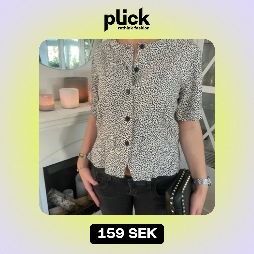 Säljer en snygg blus med svartvitt mönster och knappar framtill. Blusen har korta ärmar och en bekväm passform, perfekt för både vardag och fest. Den är gjord i ett lätt och luftigt material.