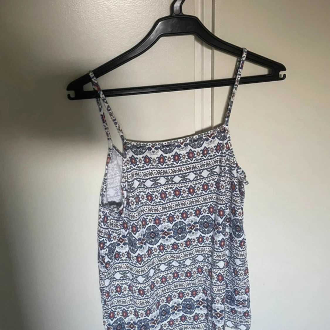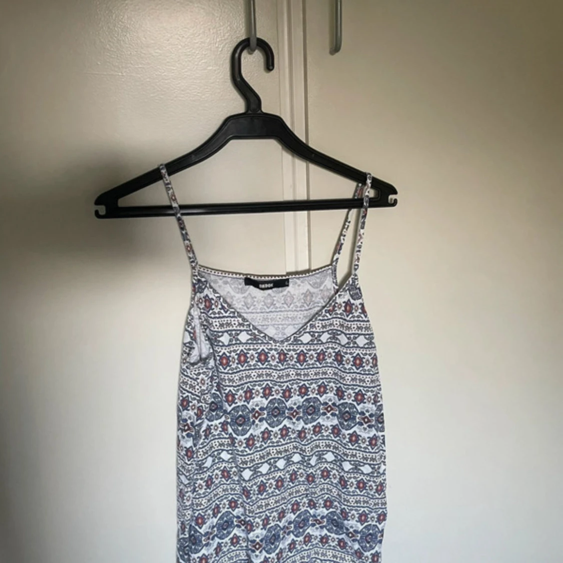 Säljer en snygg linnetopp från Bik Bok med tunna axelband och v-ringning. Toppen har ett detaljerat mönster i blått, rött och vitt och är gjord i mjuk bomull. Perfekt för dig som gillar boho-vibe och vill ha något luftigt och fräscht!!