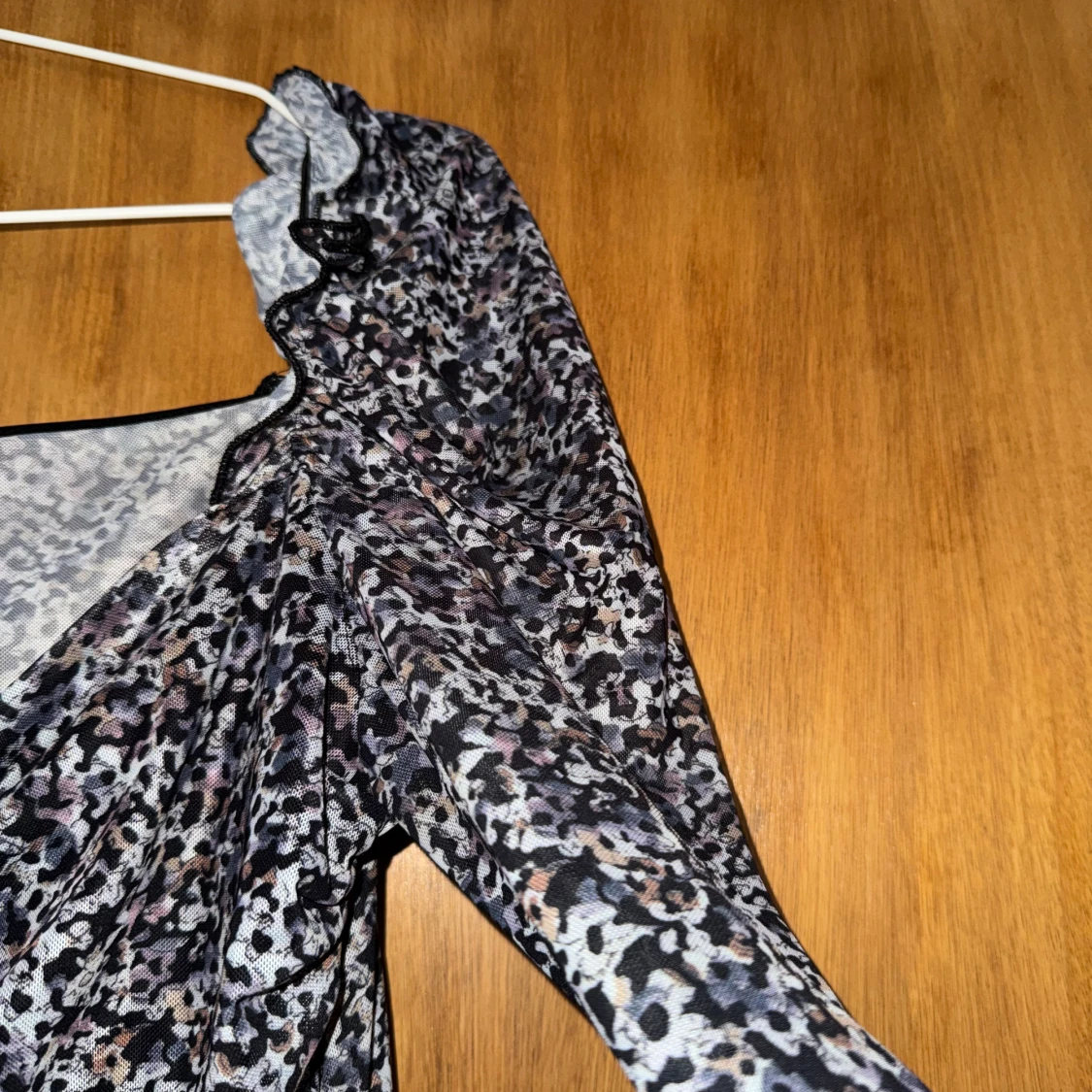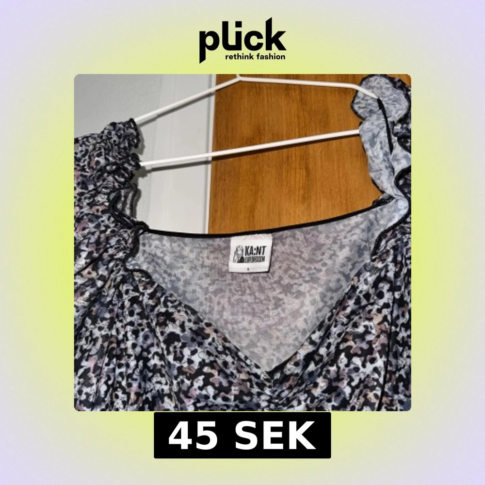 Säljer en topp från KA:NT Copenhagen i storlek L. Toppen har ett abstrakt mönster i svart, grått och lila toner, v-ringad hals och långa puffärmar med rynkade detaljer. Materialet är tunn och stretchig polyester som ger en snygg passform.