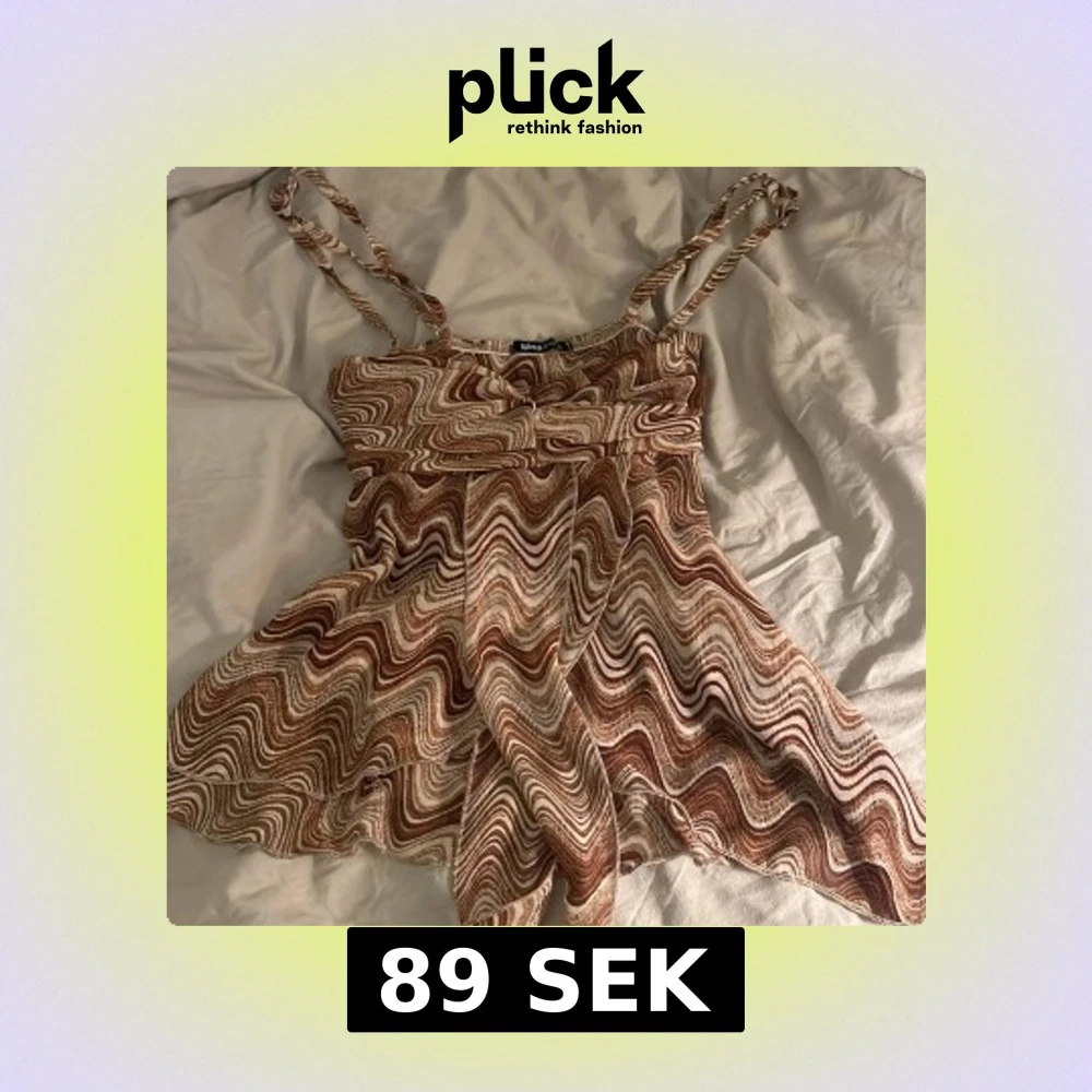 Snygg toppen från Gina Tricot med ett vågigt mönster i bruna och beige toner. Klänningen har smala axelband och en fladdrig kjol som ger en härlig rörelse. Perfekt för en somrig look!