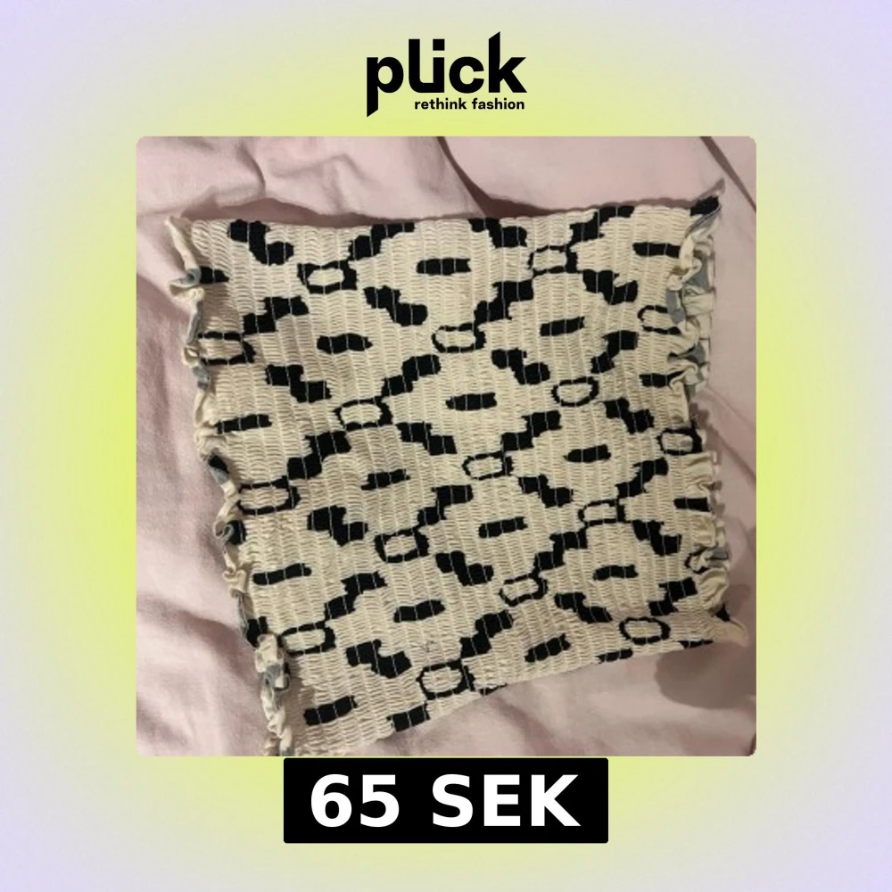 Säljer en unik tubtopp med ett svart och vitt mönster. Toppen har en smockad design som ger en stretchig och bekväm passform. Perfekt för att lägga till en trendig touch till din garderob.