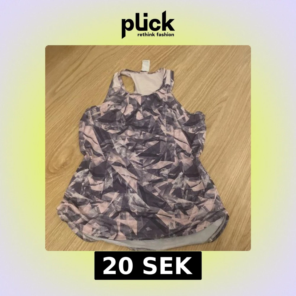 Säljer en sportig linnetopp med coolt grafiskt mönster i lila och ljusrosa toner. Toppen har brottarrygg och ärmlös design, perfekt för gymmet eller löprundan. Materialet är lätt och andas, vilket gör den skön att bära under träning.