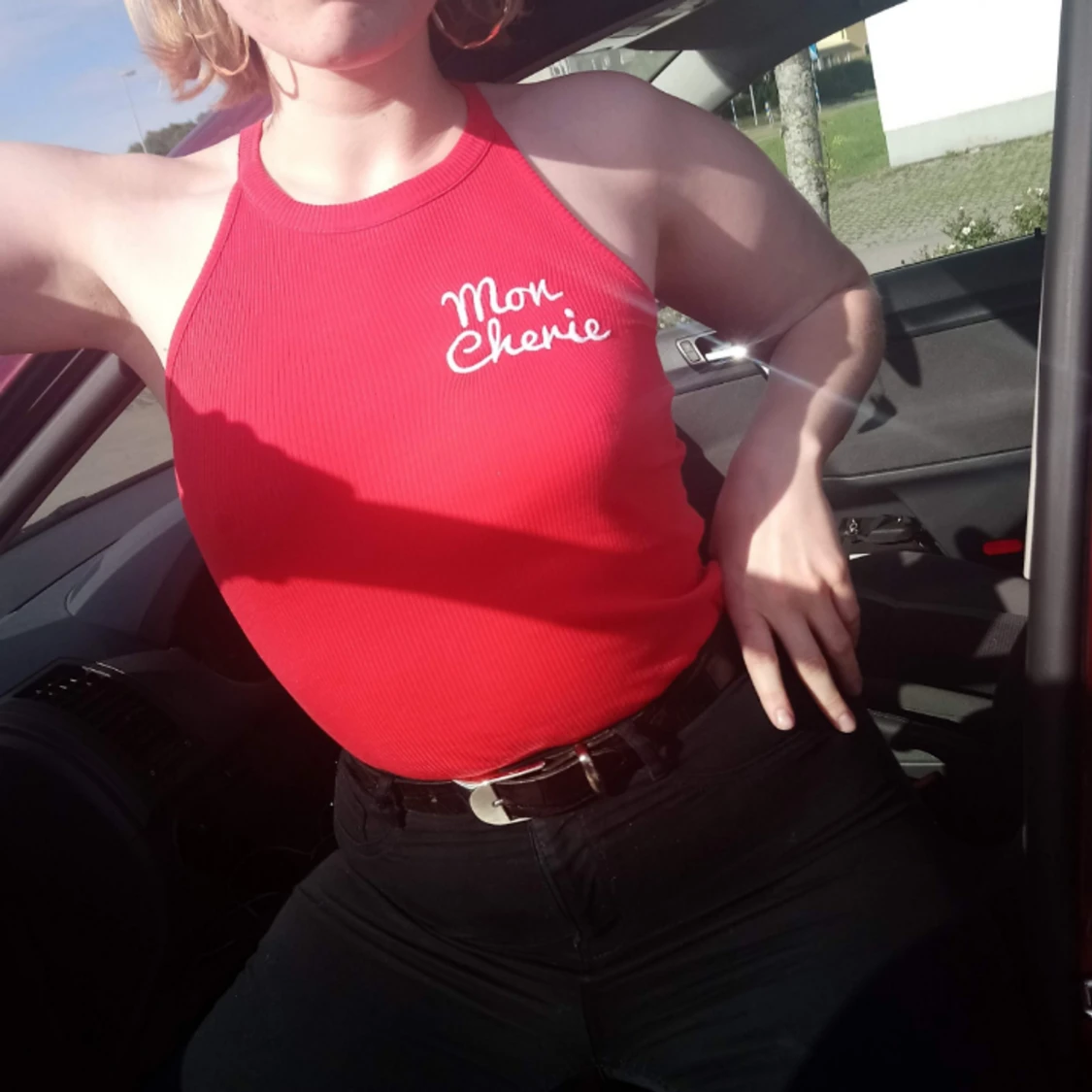 Röd crop top i storlek 38 med texten "Mon Cherie". Köparen står för frakt: 18kr med PostNord.