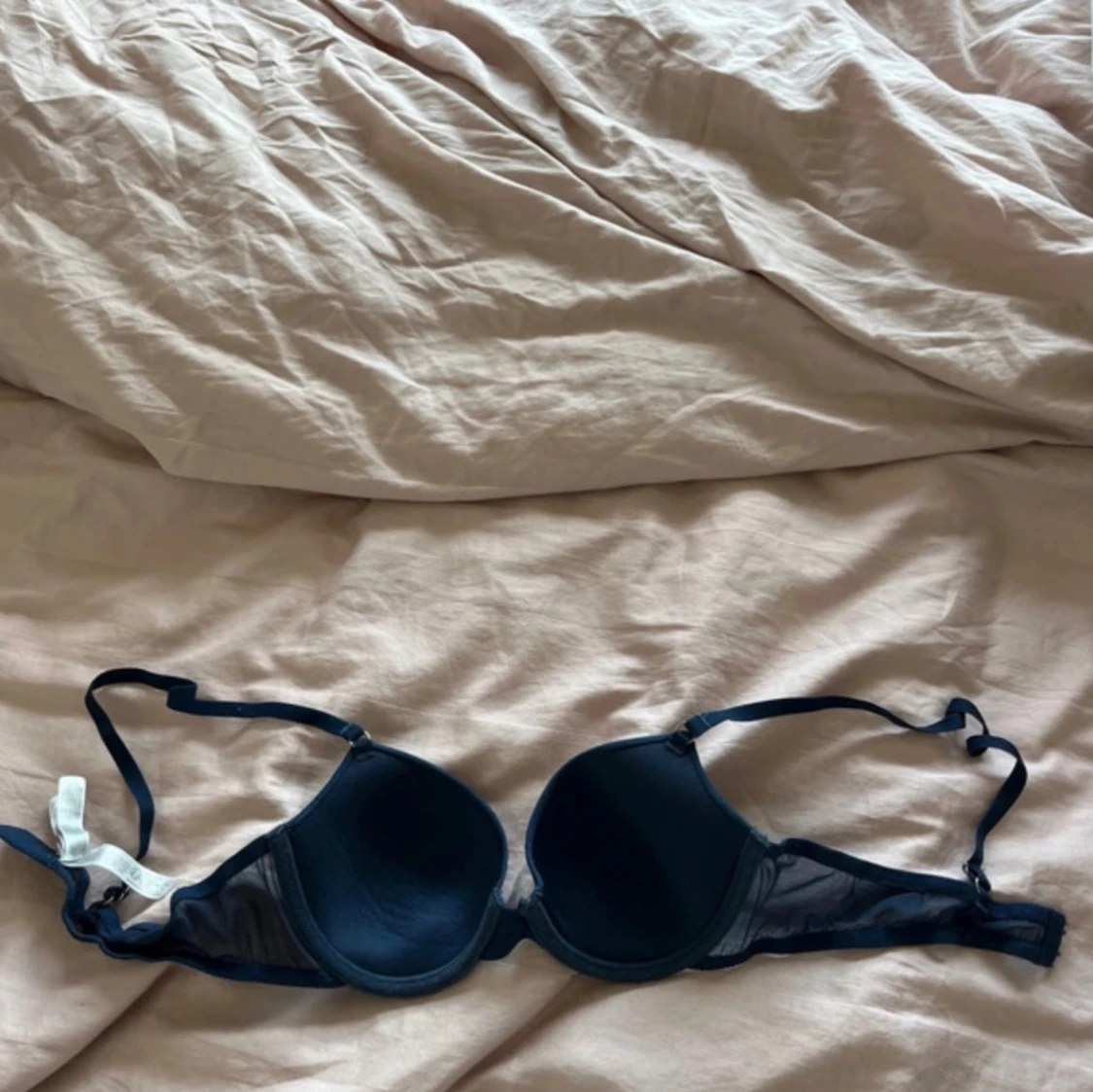 Säljer en mörkblå bh från Primark med släta kupor och justerbara axelband. Sidorna har meshdetaljer och bh:n har klassisk knäppning bak. Enkel och stilren design som passar till det mesta.