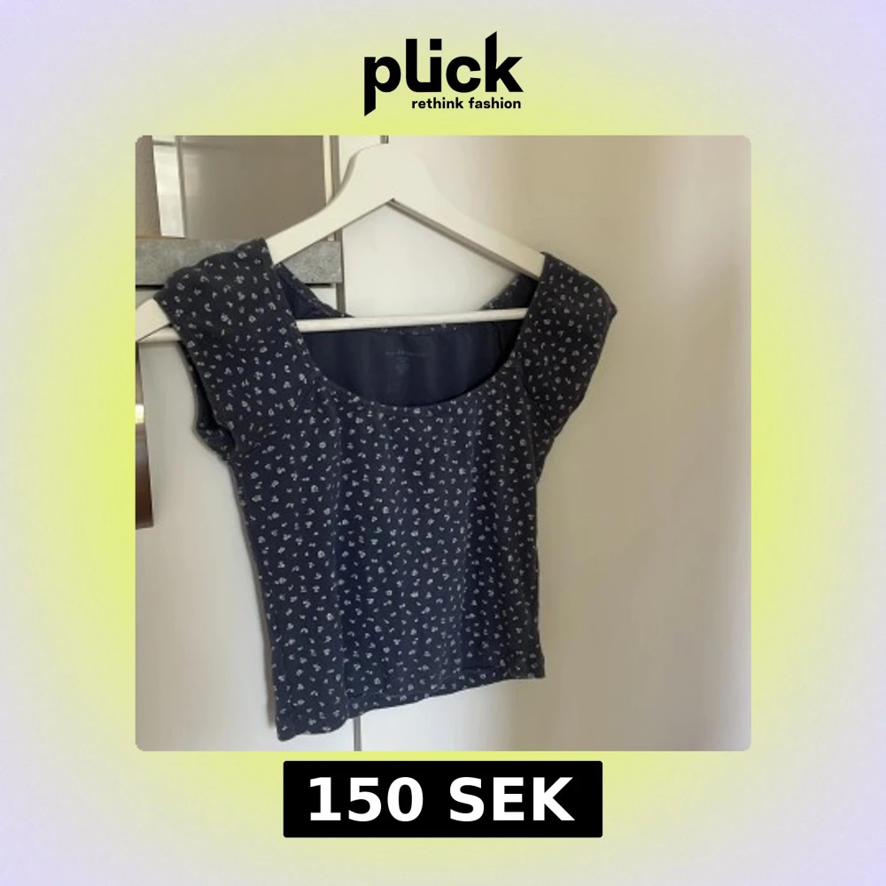 Söt mörkblå topp med små vita blommor och bred ringning. Toppen har korta ärmar och är figurnära i modellen. Perfekt för varma dagar eller somrig stil.