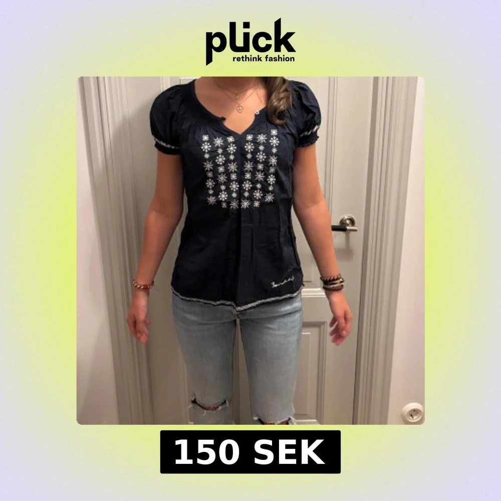 Supersöt mörkblå blus från Bondelid med vita broderade detaljer framtill, på ryggen och på ärmarna. Blusen har korta puffärmar, rung halsringning med en liten knapp och ett unikt mönster både fram och bak 🥰
