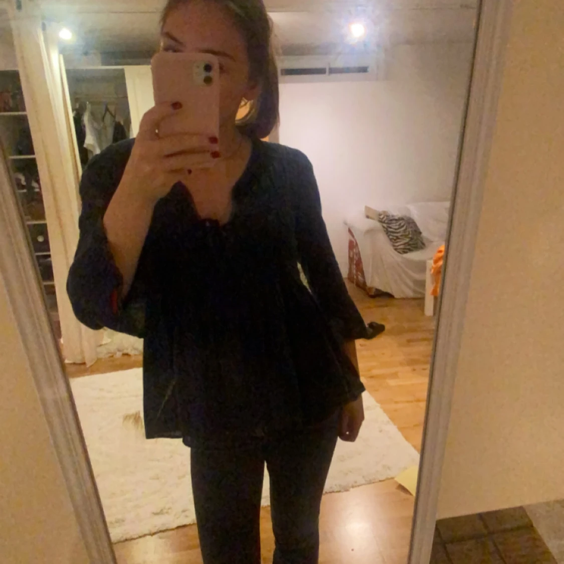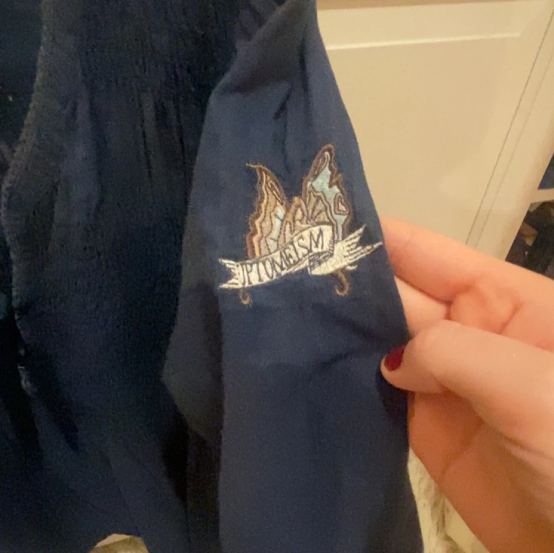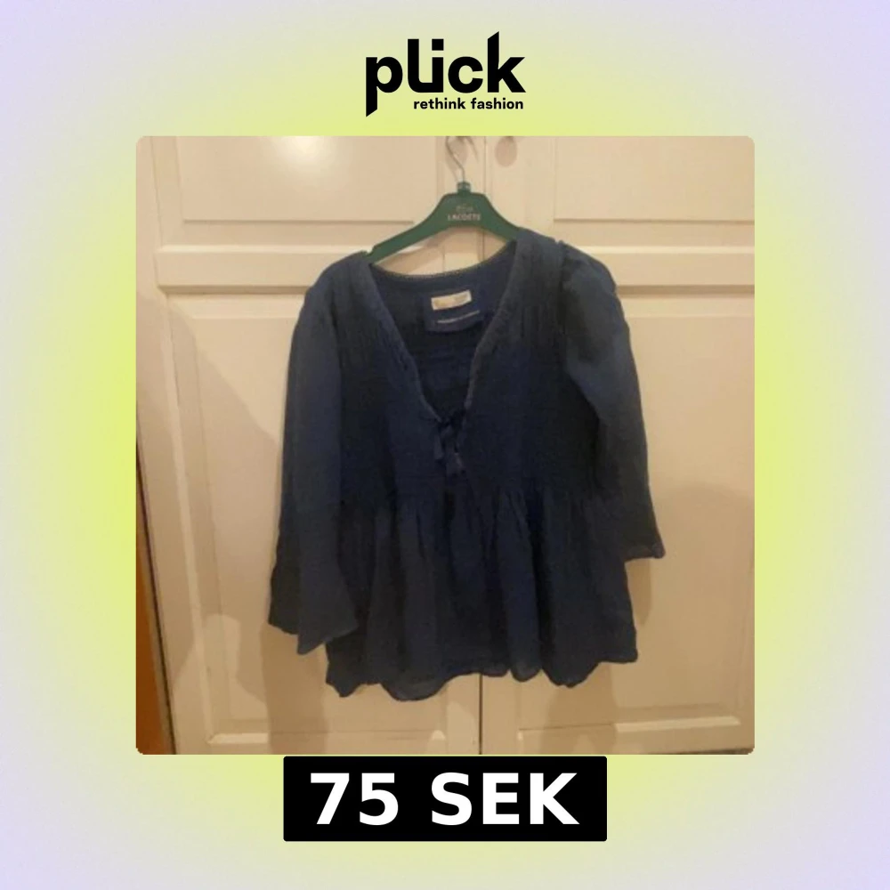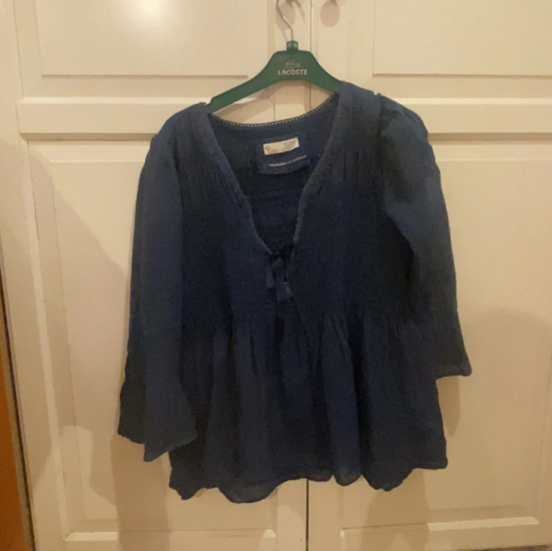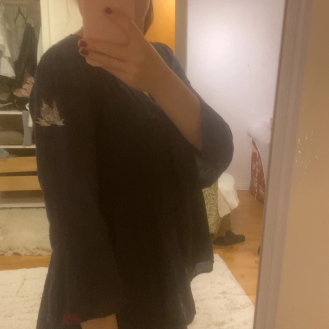 Säljer en mörkblå blus med broderad detalj på ärmen. Blusen har långa ärmar och en knytning framtill. Perfekt för en avslappnad stil.